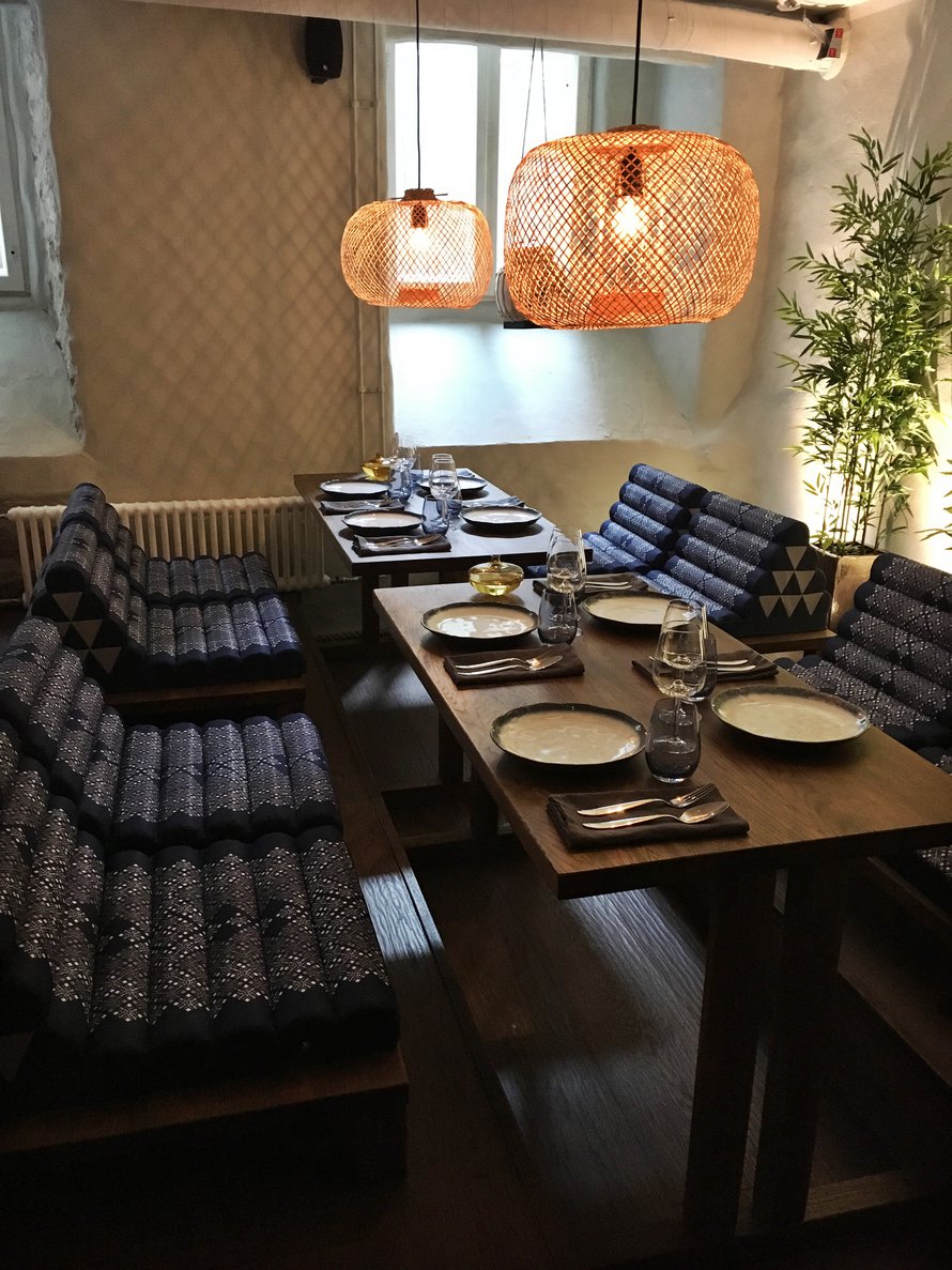 Sokkeloiseen vanhaan rakennukseen perustetussa ravintolassa on pieniä ruokasaleja, joita on mahdollista yhdistää ja erotella verhoilla seurueiden koon mukaan. Ruokasaleista houkuttavin on nojatuolimaisin mattoistuimin sisustettu Kantok-huone.