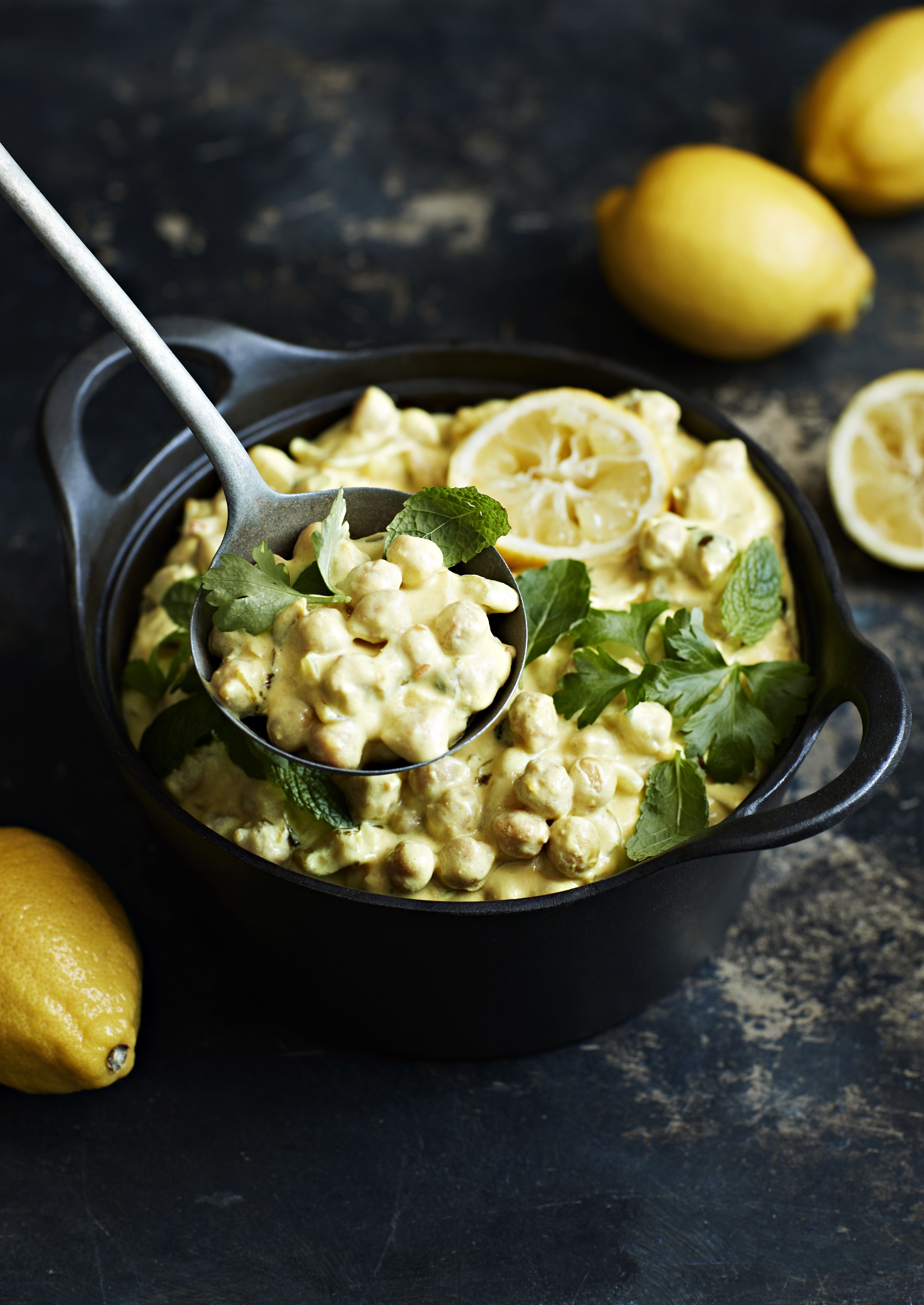 Sitruunainen kikhernepata on ihanan tuhti ja kermaisen oloinen. Seesaminsiemenistä tehdyllä tahinilla ja kaurakermalla jalostettu liemi muhii padassa täyteläiseksi, mutta siihen tuodaan sitruunalla reilusti raikkautta.