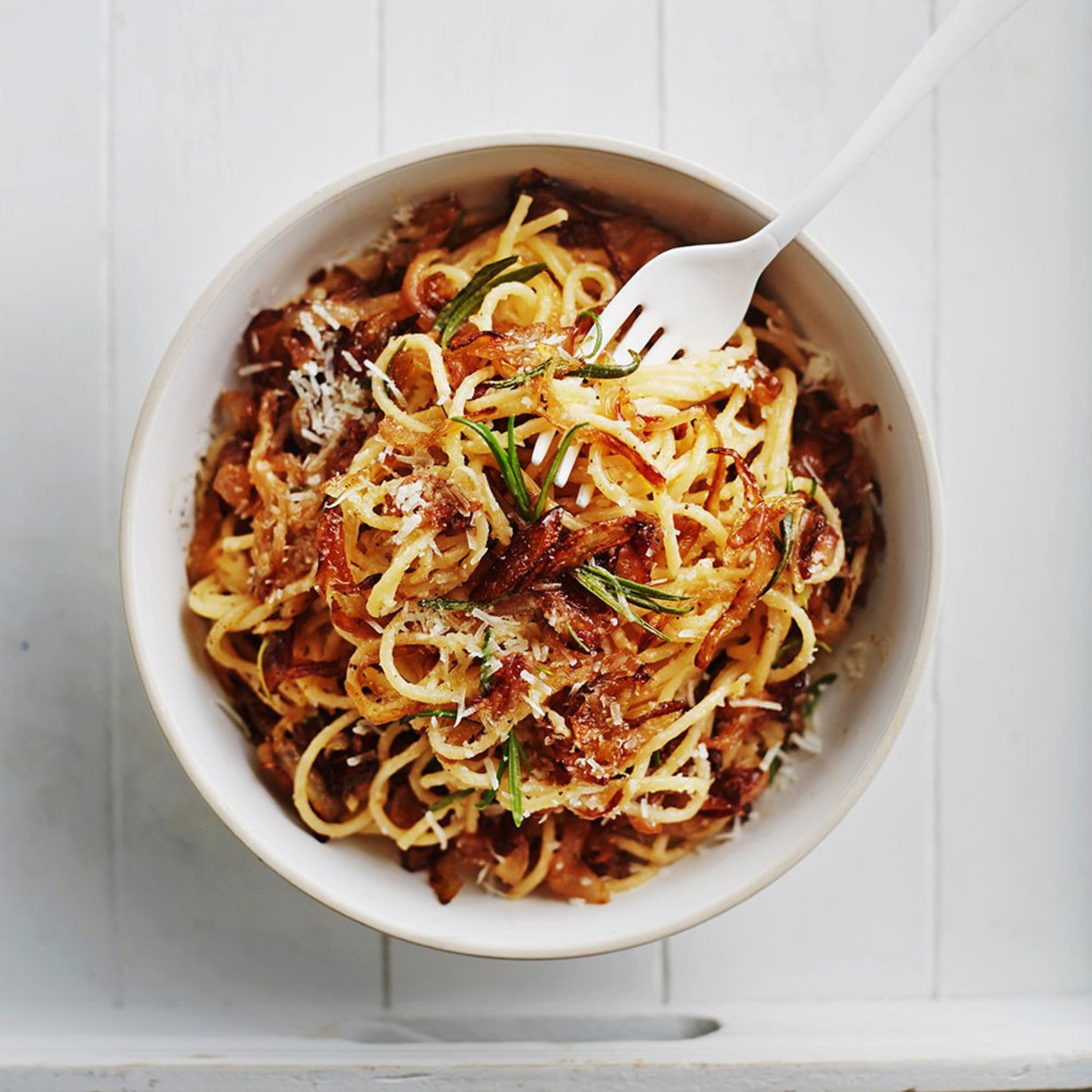 Tämä carbonara ei pancettaa tai pekonia kaipaa! Pastan salaisuus on makeiksi paistuneissa sipuleissa. Aluksi sipulit ruskistetaan sokerin kanssa. Kun pasta on keitetty ja valutettu, sen joukkoon sekoitetaan kananmuna-juustoseos sekä lempeät sipulit. Ja mikä parasta: pasta on lautasella vartissa. Katso videolta, miten lihaton versio carbonarasta valmistuu.