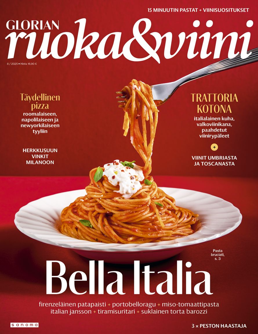 Glorian ruoka & viinin syysnumeron teemana on ihana Italia, jonka makuun pääsee heti kansilehdeltä. Muheva pasta bruciati valmistuu yhdellä pannulla. Pastanystävää hemmotellaan myös muun muassa portobelloragulla ja karamellisoidulla sipulipastalla, jotka onnistuvat vartissa.