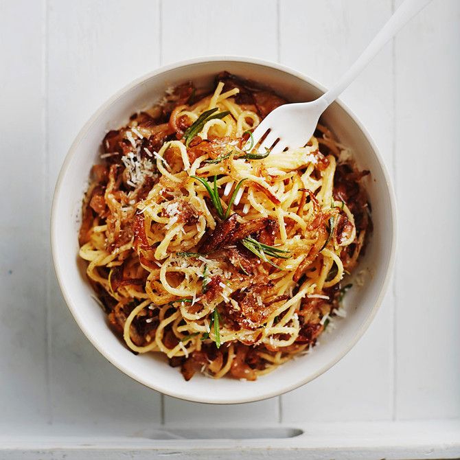Tämä carbonara ei kaipaa pekonia, sillä ihanan rapeiksi karamellisoidut sipulit ja valkosipulit tekevät siitä tolkuttoman hyvää. Viimeistele kananmunalla ja juustolla, jotta saat pastaan herkullisen vaalean ”kastikkeen”.