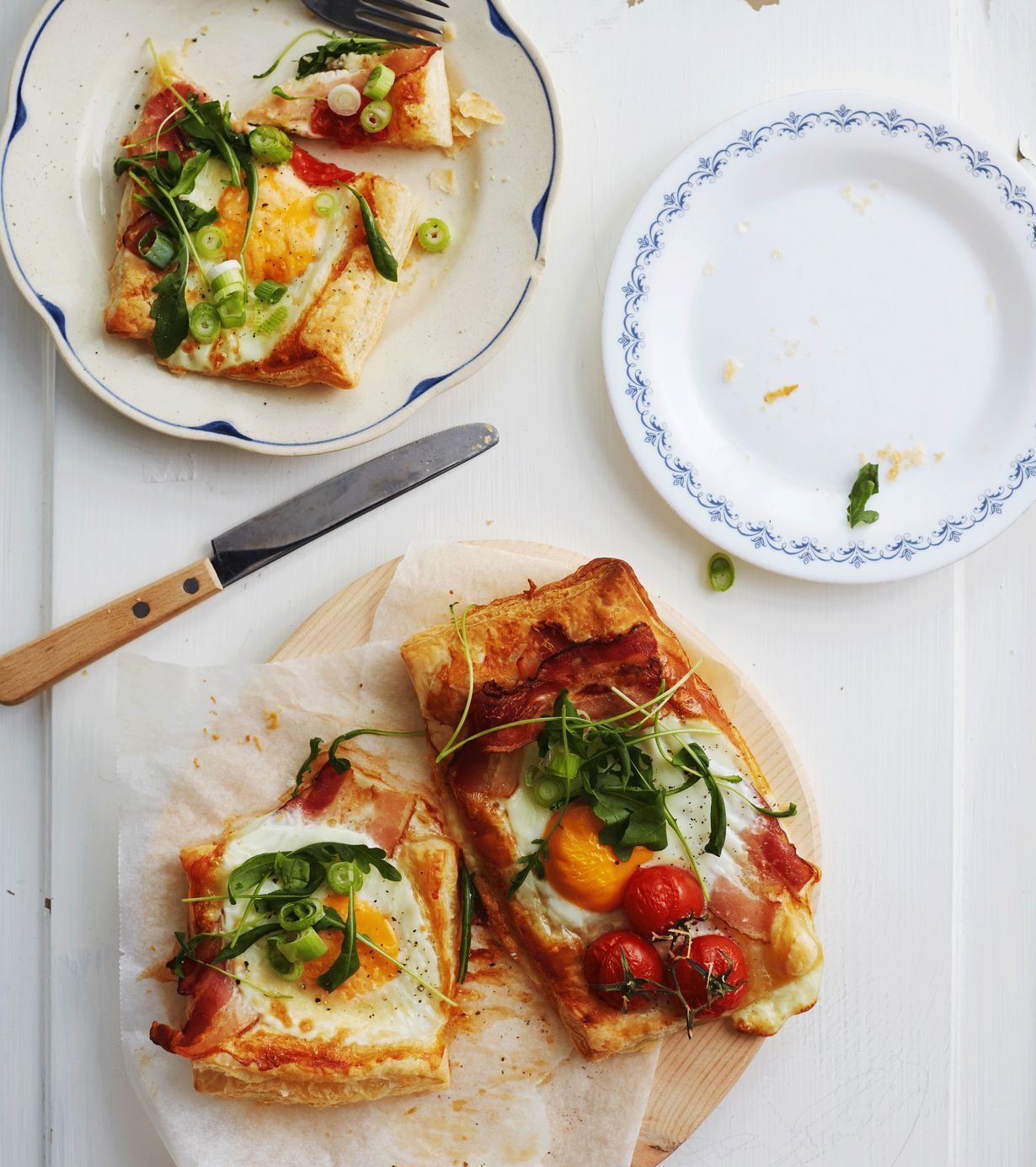 Näillä supernopeilla aamiaispiirakoilla lähtee päivä herkullisesti käyntiin! Piirakat ovat näyttäviä, mutta mutkattomia valmistaa. Kokoa valmiille lehtitaikinalle pekonia, kirsikkatomaatteja ja riko kananmuna päälle. Kun piirakat ovat paistuneet ihanan rapeiksi, viimeistele ne kevätsipulisilpulla ja rucolalla ja rouhi päälle hieman mustapippuria.
