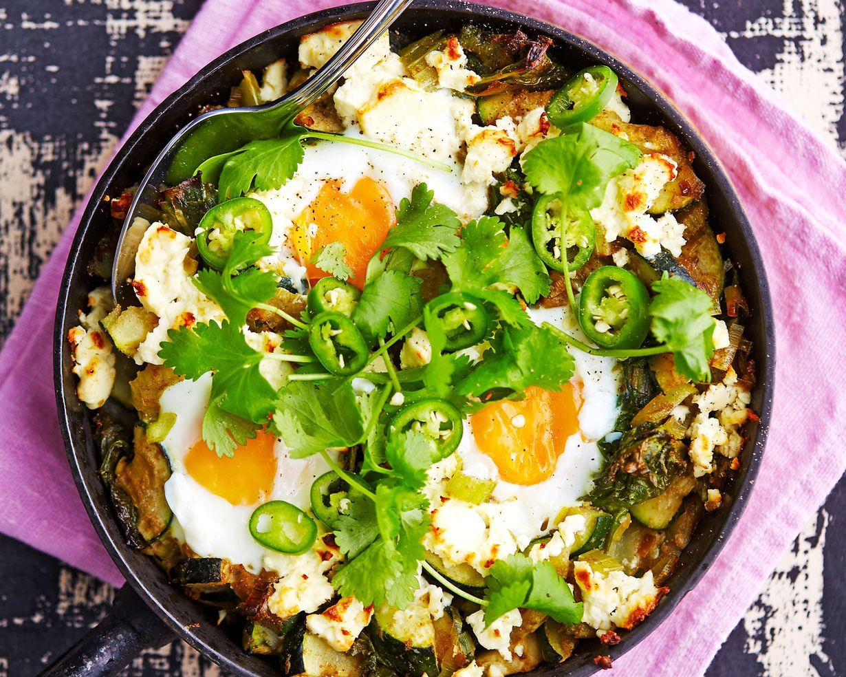Shakshuka on Lähi-idässä suosittu aamiaisruoka. Nimestään huolimatta aamiaispannu on helppo valmistaa: kananmunat kypsyvät kuin itsestään mausteisessa tomaattiliemessä. Tässä vihreässä shakshukassa on perinteistä versiota vähemmän tomaattikastiketta mutta sitäkin enemmän terveellisiä vihreitä kasviksia. Höystä aamiaispannu lehtikaalilla, pinaatilla, kesäkurpitsalla sekä sellerin varrella. Riko päälle kananmunat ja lisää vielä feta- tai raejuustoa.
