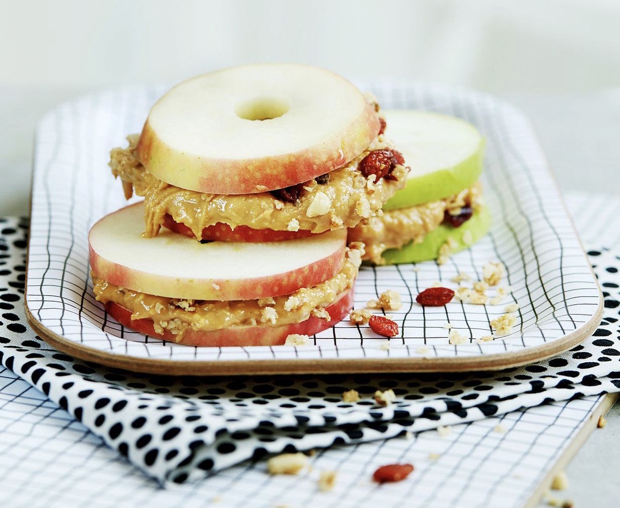 Tässäpä aikamoinen superohje: vegaaninen, gluteeniton ja hetkessä valmistuva herkkupala. Omena-maapähkinäeväs jäljittelee kerrosleipää ja yllättää erilaisilla tekstuureilla: raikasta hedelmää, täyteläistä maapähkinävoita ja rapeaa mysliä.