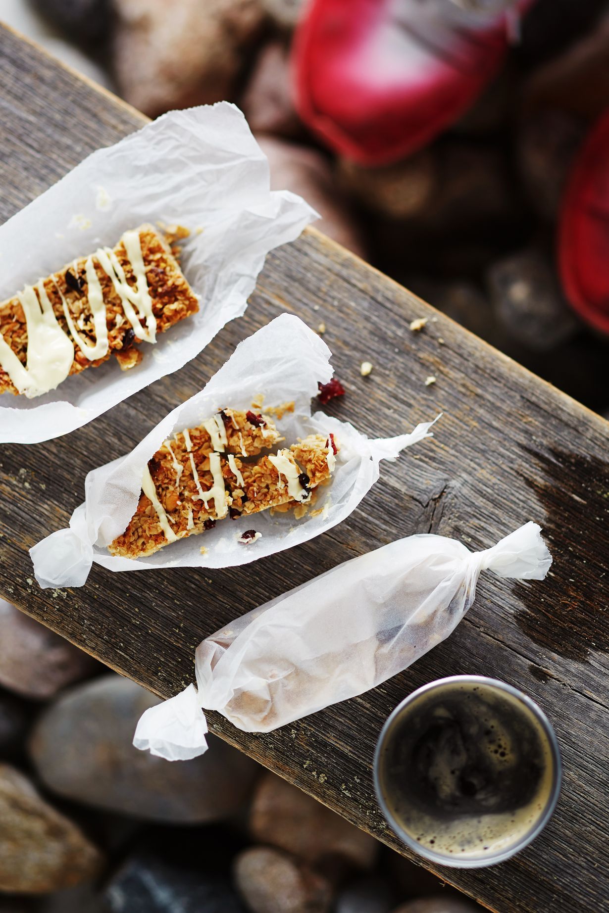 Valkosuklaa-myslipatukoiden ohjeen löydät täältä. Hyviä vaihtoehtoja retkelle ovat myös pähkinäiset puhtipalat sekä kookoksen makuiset raakapallot.
