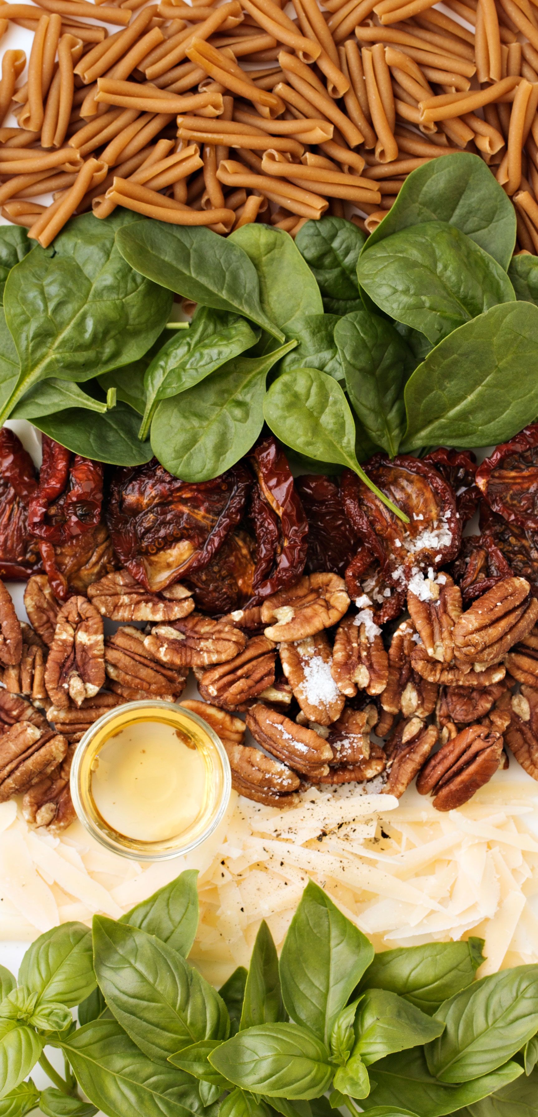 - Huuhdo pinaatinlehdet. Paahda pekaanipähkinöitä 5 minuuttia kuivassa pannussa. Hienonna basilika ja aurinkokuivatut tomaatit (säästä 3 rkl öljyä kastikkeeseen). Lisää tomaatit ja parmesaanilastut pastaan.