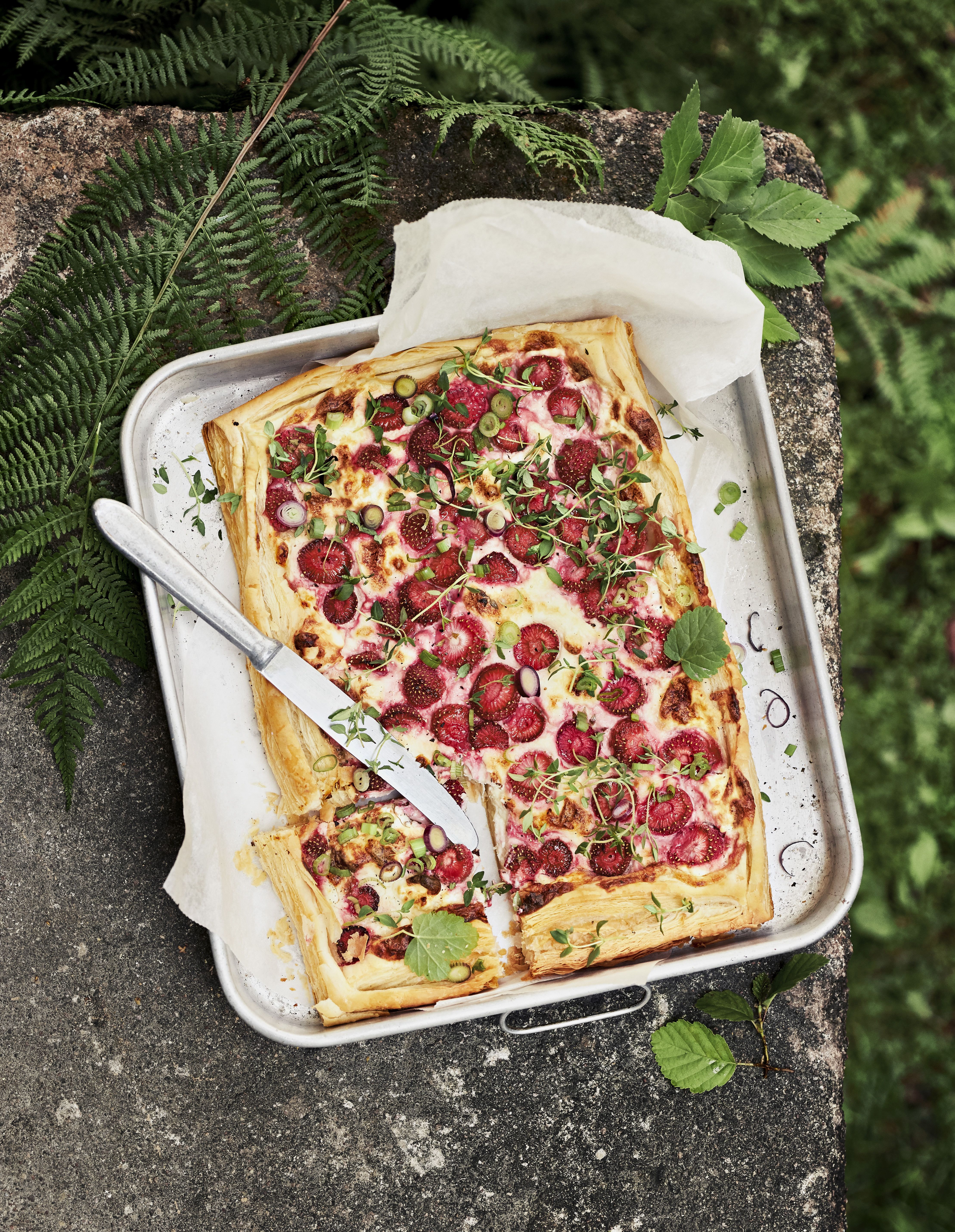 - Feta-mansikkapiirakka: Pikavauhtia syntyvän piirakan juju on suolaisen fetan ja makeiden mansikoiden onnellinen liitto, jonka sinetöivät chili ja sitruuna.