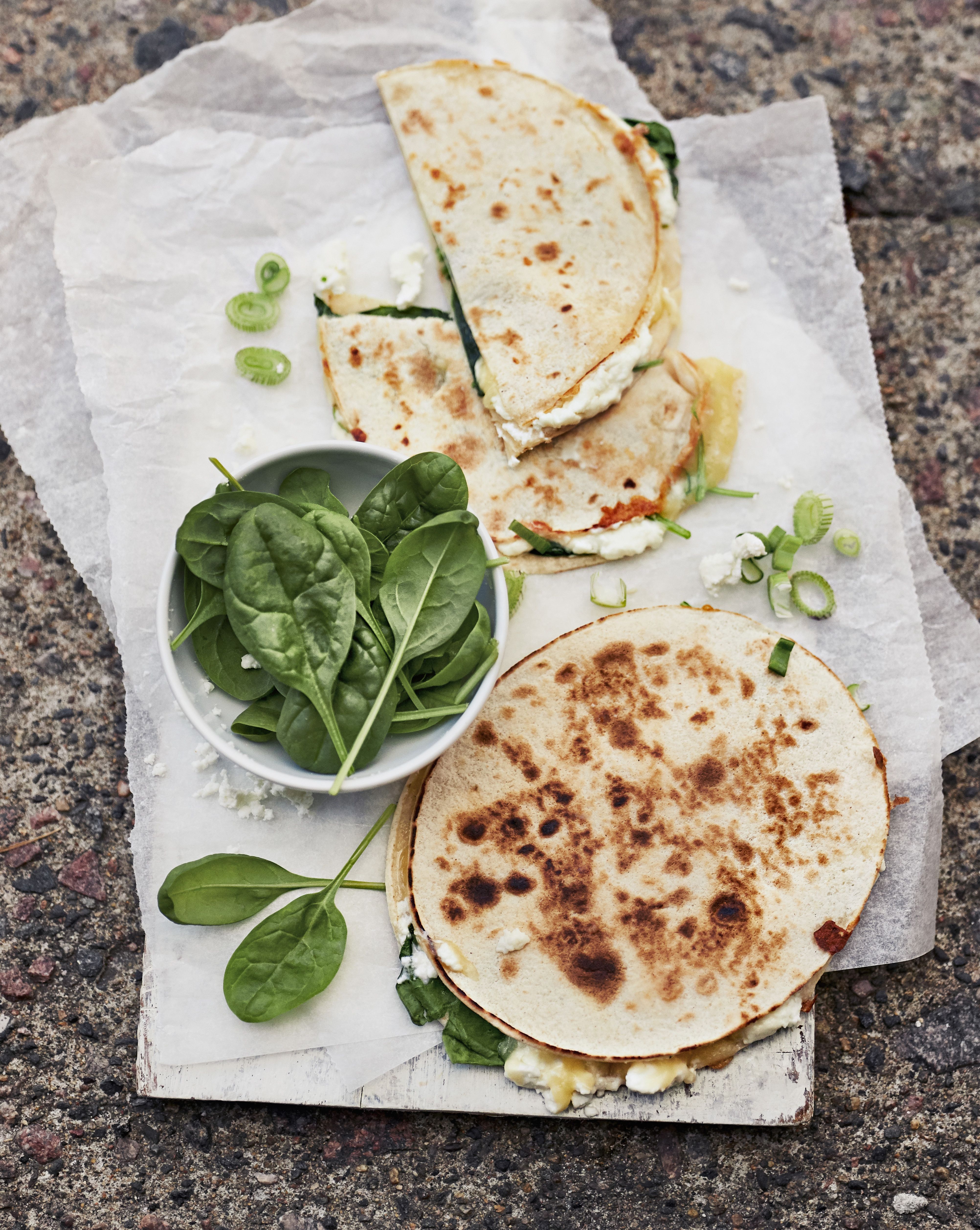 Pikkunälän taltuttaja fetaquesadilla valmistuu pannussa tai grillissä parissa minuutissa. Murenna tortillaletulle fetaa ja lisää seuraksi salaattipinaattia, paloiteltuja oliiveja ja aurinkokuivattua tomaattia. Ripottele vielä hienonnettua tilliä joukkoon ja paina päälle toinen tortilla. Paahda ilman rasvaa, muutama minuutti molemmilta puolilta, tai 200-asteisessa uunissa noin 10 minuuttia.