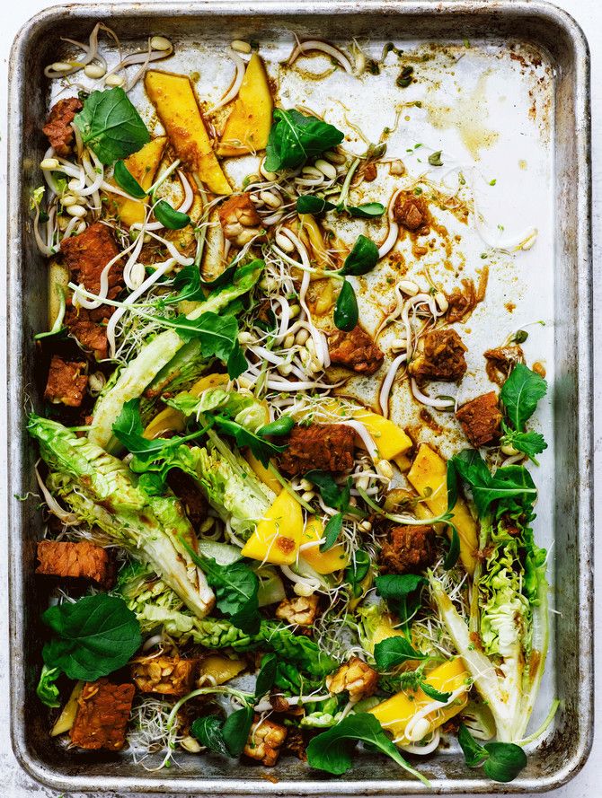 Oletko kokeillut tempehiä? Se on soijapavusta fermentoimalla tehty valmiste, josta saa helposti kasvispäivän proteiinit. Marinoimalla maku ja rakenne mehevöityvät. Tässä salaatissa tempeh ensin paistetaan ja sitten marinoidaan inkiväärimarinadilla. Salaatin joukkoon lohkotaan makean mangon lisäksi sydänsalaattia ja yrttejä.