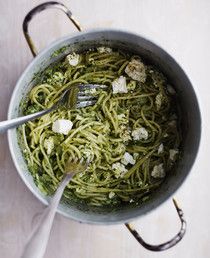 Klassikkopasta syntyy vähistä aineksista, joskus jopa ilman kaupassakäyntiä. Raaka-aineet ovat niin simppelit ja säilyvät, että niitä kannattaa olla aina varastossa. Spagetin joukkoon tehdään kastike pakastepinaatista ja joukkoon murennetaan makua antamaan fetaa. Tuorehedelmäsalaatti jälkiruokana toimii täyttävän pastan jälkkärinä.