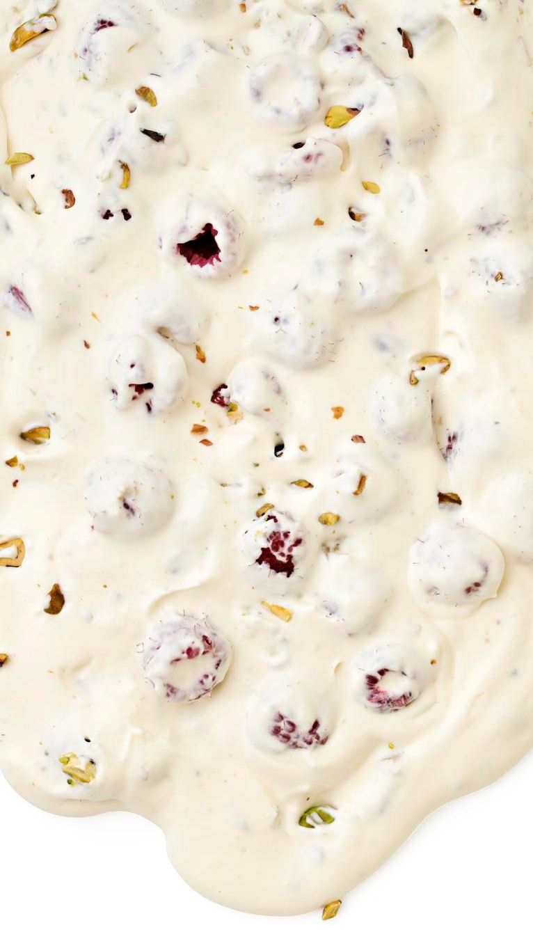 - Kuori ja hienonna pistaasipähkinät. Kääntele ne, vadelmat ja ruusuvesi vaahtoon.