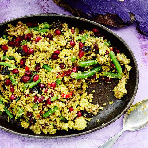 Jos olet mausteisen itämaisen ruuan ystävä, vartin kuskusia on pakko kokeilla. Keittiöstä leijailee kanelin, korianterin, kurkuman ja chilin tuoksu eteiseen asti. Jos et vielä ole kokeillut pakastealtaassa myytäviä valmiiksi irroteltuja granaattiomenansiemeniä (ihan supertuote!), sekin hoituu tätä ruokaa kokatessa.