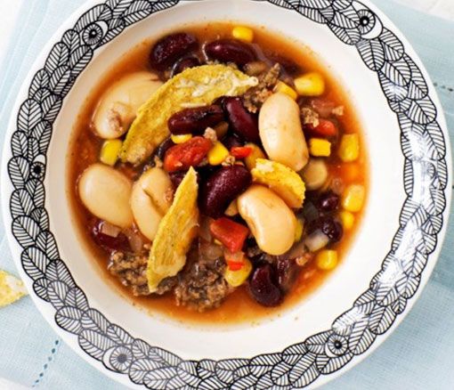 Meksikolainen keitto on koko perheen suosikki! Tuhdin keiton aineksina on papuja ja jauhelihaa ja sen juju päälle ripoteltavat nacho-lastut, juustoraaste, avokadokuutiot ja ranskankerma. Ripotteiden avulla jokainen ruokailija voi höystää keiton mieleisekseen.