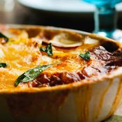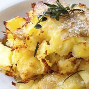 Ohuen ohuet perunaviipaleet tiivistyvät uunissa ihanan pehmeäksi perunakakuksi, joka lopuksi ruskistetaan pinnaltaan rapeaksi. Tämän tiiviin perunakakun salaisuus on maukkaassa kanaliemessä, jota lusikoidaan perunaviipalekerrosten väliin.
