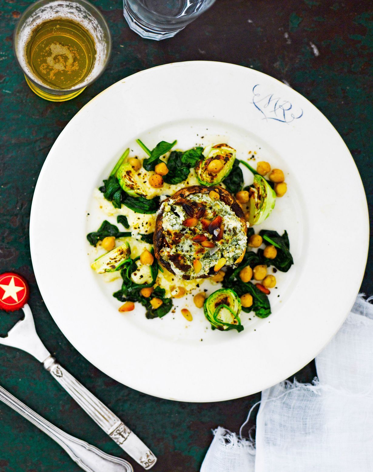 Tämä annos on aivan yhtä näyttävä kuin herkullinenkin. Lihaisan täyteläiset portobellosienet täytetään lehtikaalipestolla ja tarjotaan esimerkiksi polentamuusin kanssa.