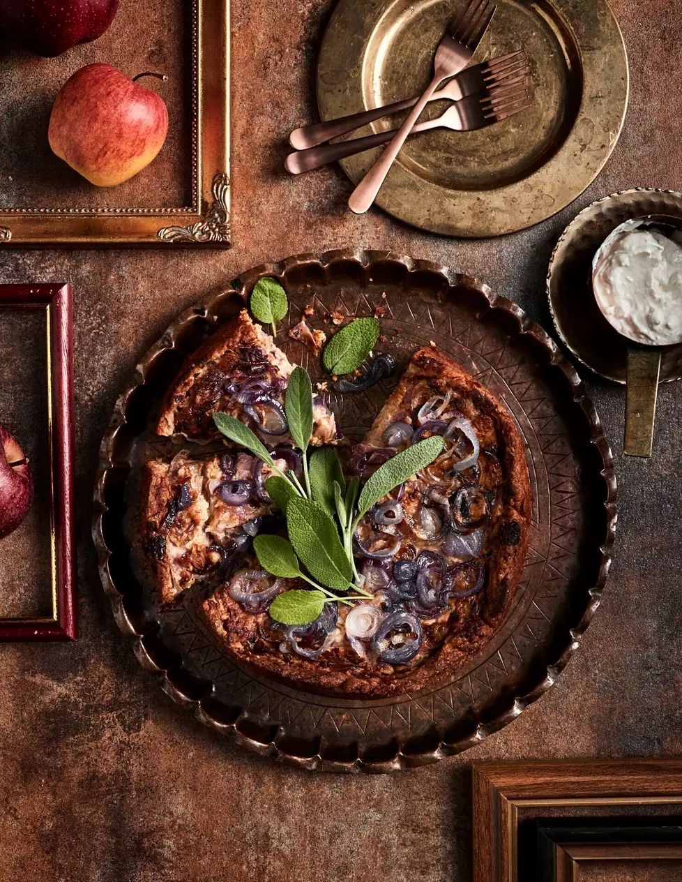 Punasipulista ja omenasta leivottu piirakka maustetaan ripauksella lakujauhetta. Laku on yllättävä maustaja, mutta oikeastaan ei sen ihmeellisempi kuin lakritsin makua muistuttava anis. Lakritsi sitoo omenan ja punasipulin maut sopuisasti ja tuo omenan makuun terävyyttä. Samoin toimii täytteeseen lorautettu balsamiviinietikka.
