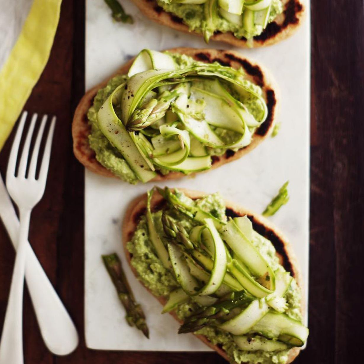 Rapeat leipäset maistuvat ihanilta herne-fetatahnan kanssa, joka on maustettu appelsiinin kuorella ja mehulla. Voitele leivät tahnalla ja nosta päälle sitruuna-öljykastikkeessa pyöriteltyä parsasalaattia. Ohjeessa leipä tehdään itse, mutta voit myös oikaista käyttämällä valmista vaaleaa leipää.