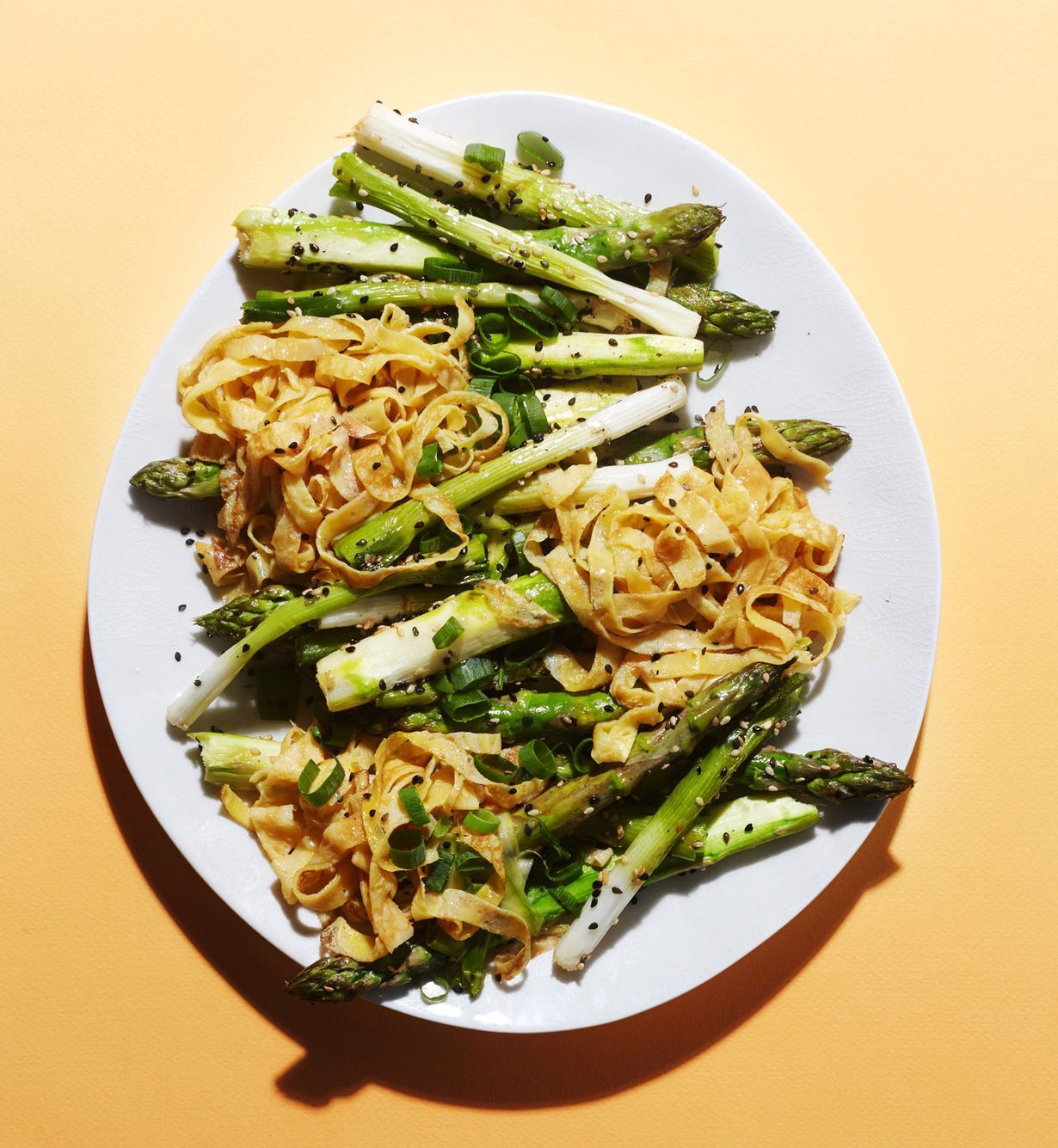 Hauskannäköisessä annoksessa ei ole pastaa, vaan kananmunaa. Munanauhat sopivat täydellisesti yhteen uunissa paahdettujen parsojen ja kevätsipulin varsien kanssa. Munanauhat on helppo tehdä: paista ohuet munakaslevyt ensin pannulla, rullaa jäähtyneet levyt kääretortun tapaan ja leikkaa nauhoiksi.