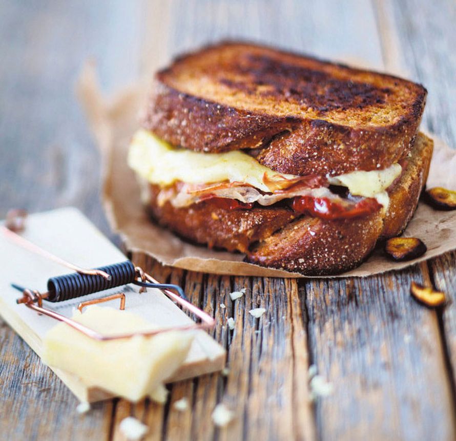 Siteen oivalsimme: cheddarjuustosandwich! Niissä maalaisleipäviipaleiden väliin pannaan ilmakuivattua kinkkua, cheddarjuustoviipaleita, balsamicosipuleita ja aurinkokuivattuja tomaatteja. Viimeisen silauksen leivät saavat, kun ne paistaa valkosipulivoissa.