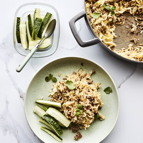 Riisi kannattaa kypsentää al denteksi eli lähes kypsäksi, ennen kuin lisäät sen kaaliseoksen joukkoon. Näin varmistat, että lopputuloksesta tulee mehevä, kun riisi ei kypsyessään ime enää nestettä itseensä.