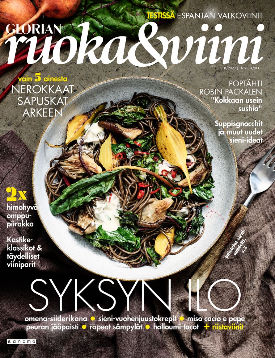 Glorian ruoka & viinin uusi numero juhlistaa runsasta omenasyksyä ja sieniä. Kastikekoulussa keitetään hollandaise ja muut suosikkisoosit ja etsitään niille viinit, joiden kanssa syntyy samettisin makuliitto. Jauhopeukaloille on tajolla upean suklaakakun lisäksi reseptit rapeisiin sämpylöihin ja superhelppoon toffee-omenapiirakkaan. Kansainvälisiä makuja löytyy rakastetun bolognesekastikkeen versioista – kokeile tehdä bolognese vaihteeksi tutun nauta-sikajauhelihan sijaan broilerista, tofusta tai raakamakkaramurusta.