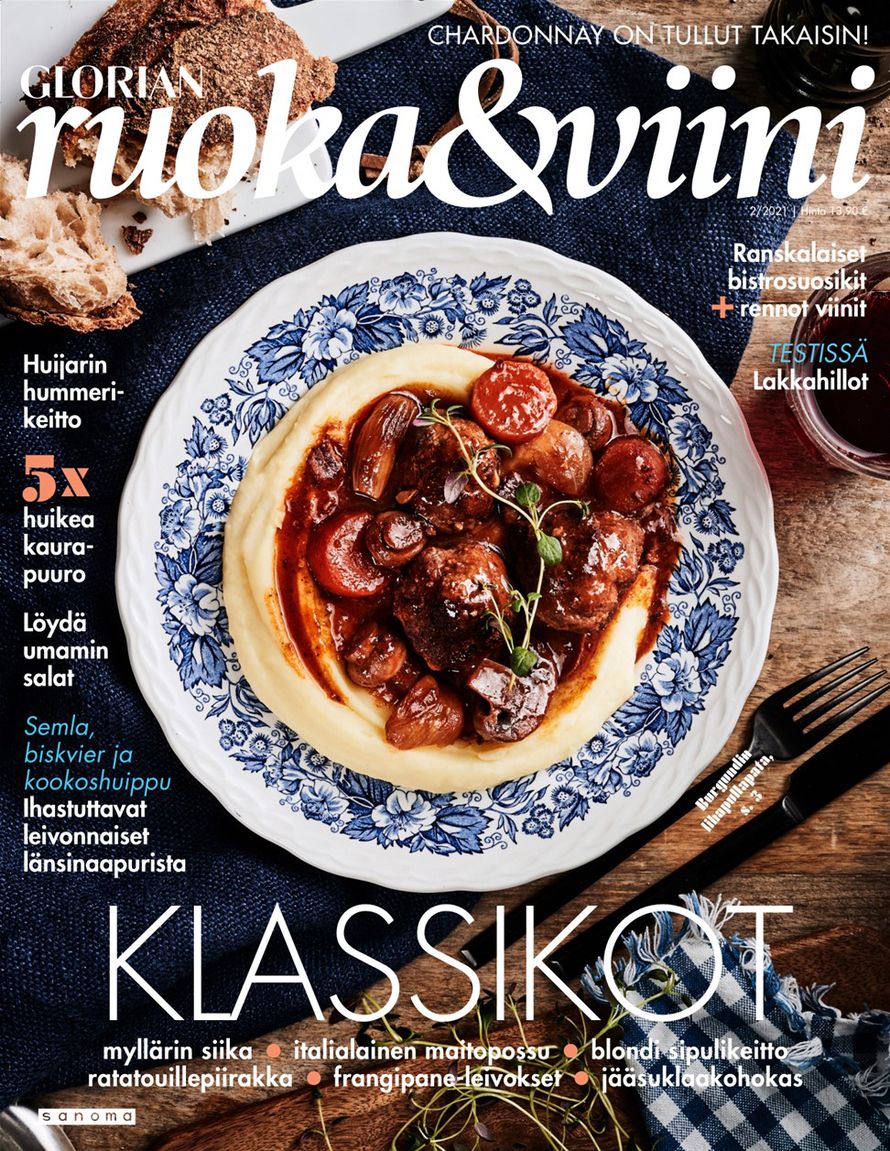 Lihapullia burgundinpadan tyyliin, sipulikeittoa ja janssoninkiusausta. Frangipane-leivoksia ja kookoshuippuja. Glorian ruoka & viinin uusin numero avaa kotikeittiön oven talvisille klassikkoherkuille!