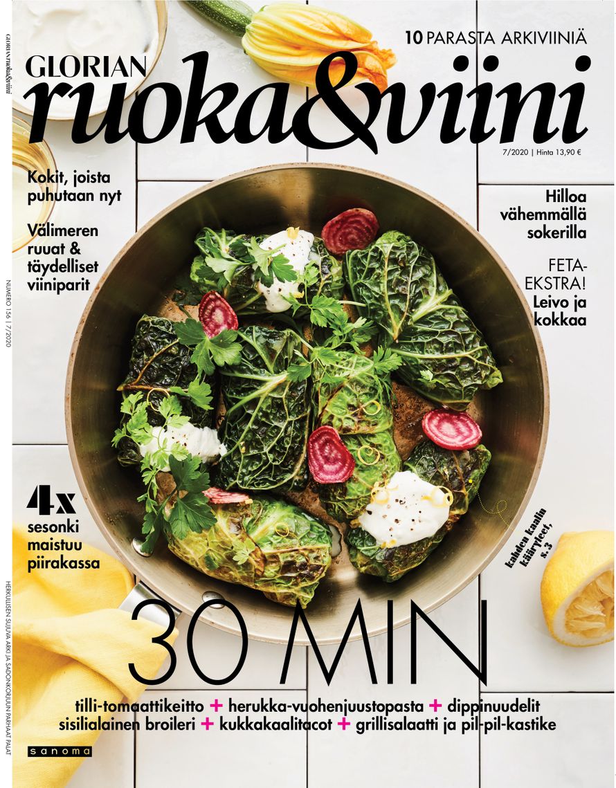 Vuoden hehkein aika kokkaamiseen on käsillä. Elokuun Glorian ruoka & viini -lehdessä kokataan puolen tunnin herkkuja kesätorin aineksista ja leivotaan satokauden mehevimmät suolaiset piirakat. Kasviksista keitellään hilloja ja soseutetaan tahnoja, jotka sopivat kastikkeeksi, lisukkeeksi ja leivän päälle. Mustaherukoita käytetään niin pastaan kuin kääretorttuun.