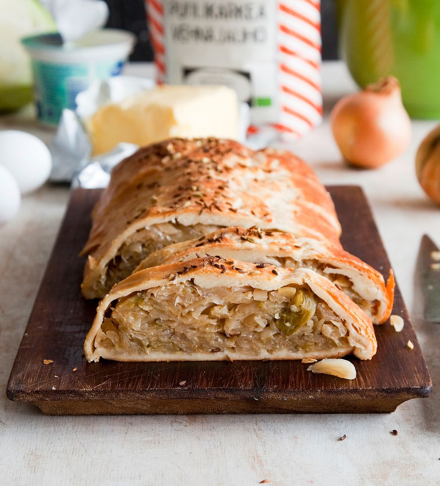 Täyte vaatii leipurilta kärsivällisyyttä: ohueksi suikaloitua kaalia, viipaloitua sipulia ja mausteita haudutetaan kattilassa kannen alla pienimmällä mahdollisella lämmöllä noin tunnin ajan. Kun täyte saa muhia verkalleen, siitä tulee pehmeää ja aavistuksen makeaa.