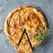 Voitele lopuksi piirakka kananmunalla ja ripottele koristeeksi kuminan ja fenkolinsiemeniä. Muista pistää haarukalla piirakan pintaan muutama höyryaukko, niin kansi ei repeile uunissa. Piirakka kypsyy ja saa kauniin kullanruskean värin uunissa noin 45 minuutissa.