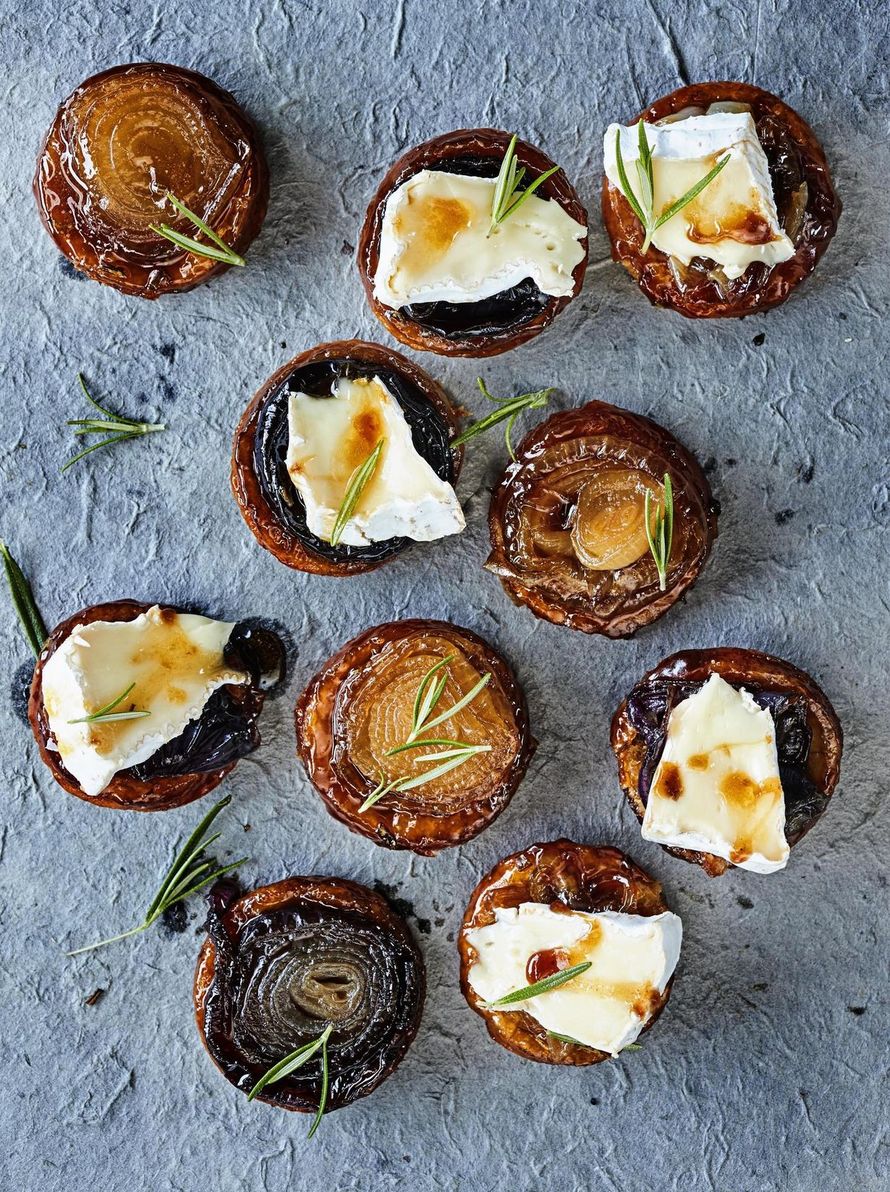 Tätä kauniimpia sipulipiirakoita (pääkuvassa) saa hakea. Maun salaisuus on sipulien karamellisointi. Sipuliviipaleet sujautetaan muffinipellin koloihin fariinisokerin, voin ja rosmariinin kanssa. Kun uuni on huolehtinut sipulien makeutumisesta, päälle nostetaan valmistaikinasta leikattu taikinapyörylä. Paistamisen jälkeen muffinipellin päälle toinen pelti ja keikautus, niin kauniit pikkupiiraset putoavat koloistaan. Viimeistele ne camembert-juustolla, eikä kukaan kaipaa muuta herkkua glögin pariksi. Kun käytät vaihdellen puna- ja keltasipulia, saat hauskaa vaihtelua piirakoihin.