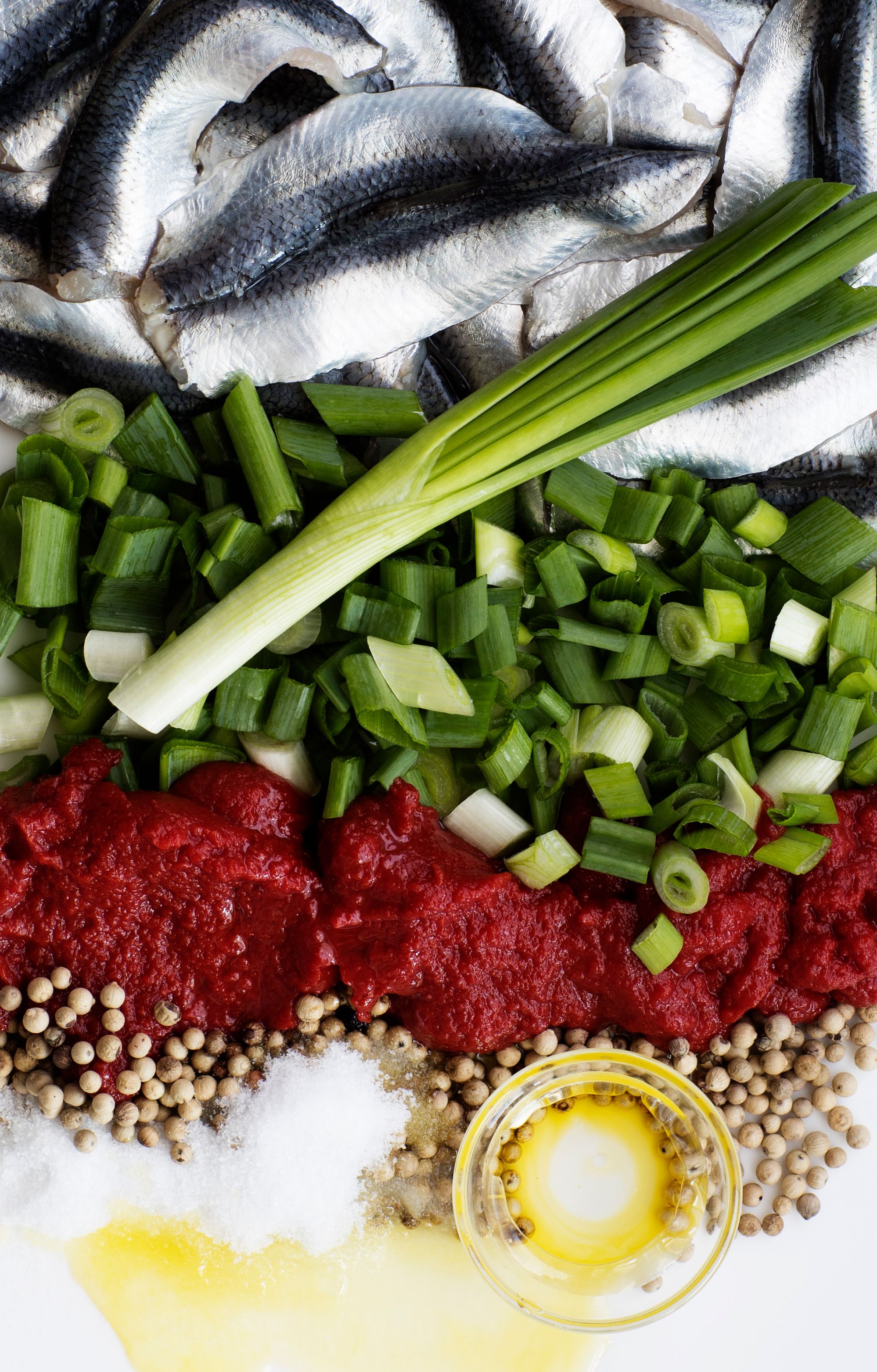 - Sekoita yrtti-tomaattisose, oliiviöljy ja etikka keskenään. Kaada seos silakoiden päälle.