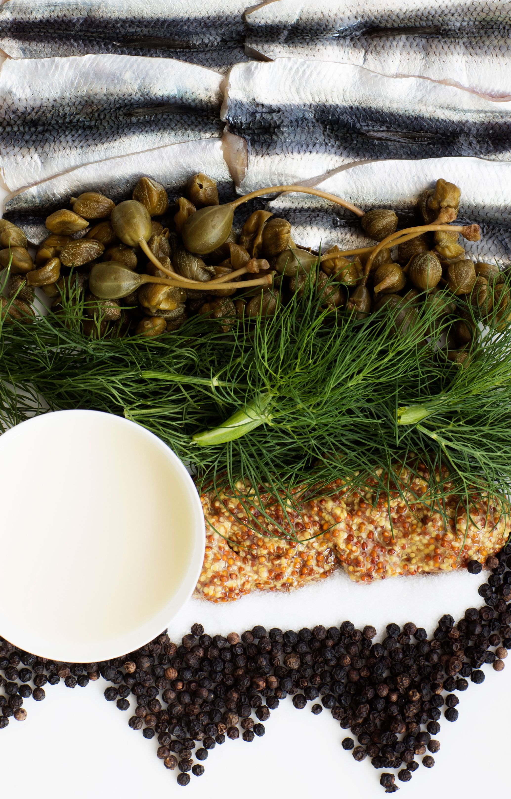 - Sekoita kerma, sinappi ja loppu tilli keskenään. Kaada seos silakoiden päälle. Ripottele pinnalle kapriksia.