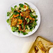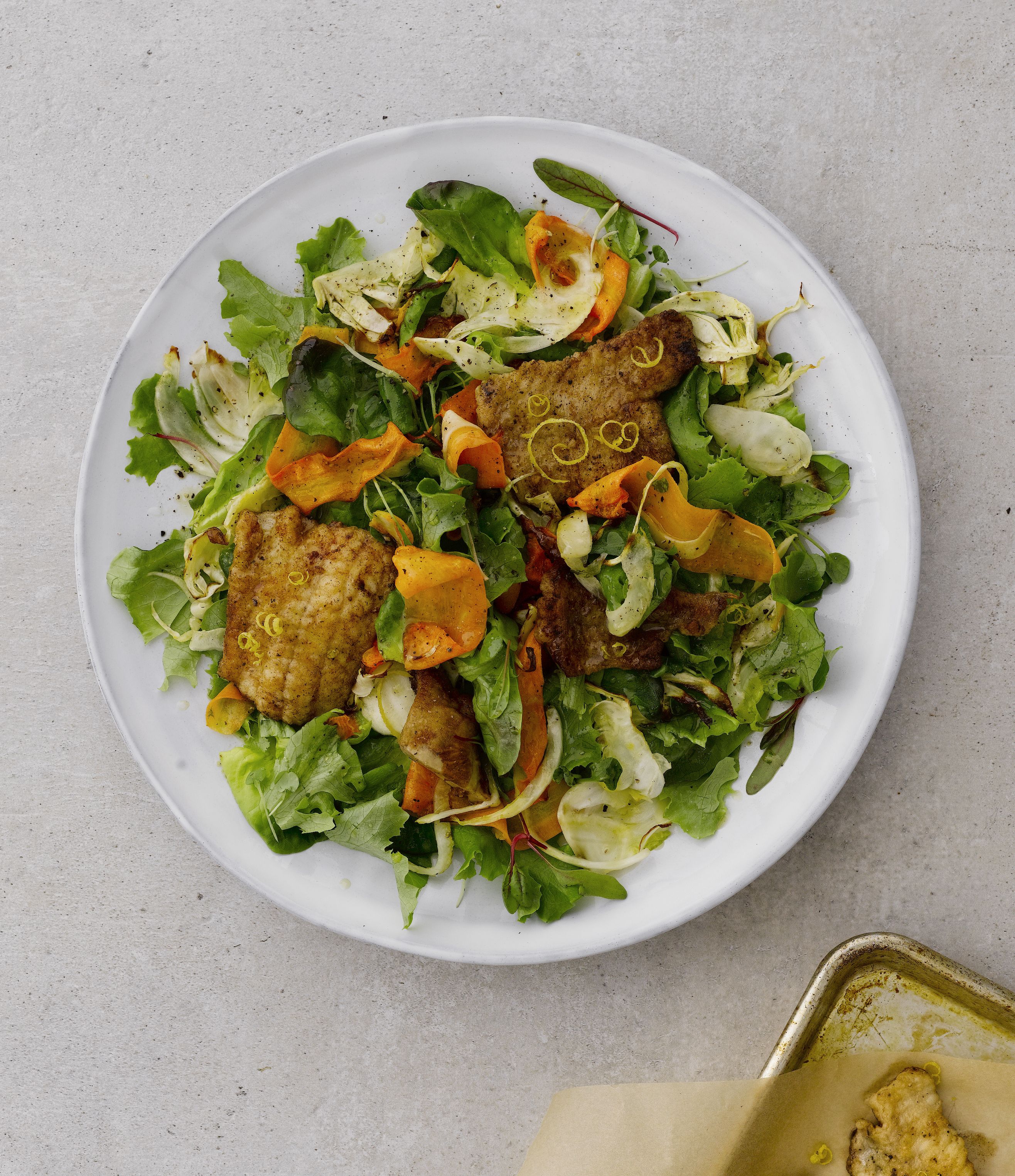 Paistetuista kalafileistä saa vaikka herkullisen salaatin. Piparjuuriremoulade antaa salaattiin täyteläisen maun.