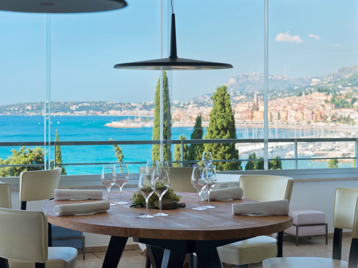 Mirazurin ravintolarakennus seisoo vuoren rinteessä, ja sen suuret ikkunat avautuvat välkkyvälle Välimerelle ja Mentonin vanhaan kaupunkiin. Paikka on henkeäsalpaava. Pelkkä huikea rakennus ei riitä, vaan olennaista on myös sijainti ihmeellisessä, suorastaan taianomaisessa maisemassa. Neljän kerroksen rakennus on kodinomainen, ja portaita tarjottimien kanssa ravaavat tarjoilijat tuovat iltaan teatterimaisuutta.