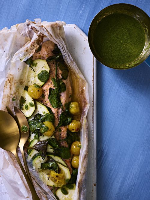 Tässä nieriää nyytissä -reseptissä kalan kanssa leivinpaperin sisässä kypsennetään tomaattia ja kesäkurpitsaa.