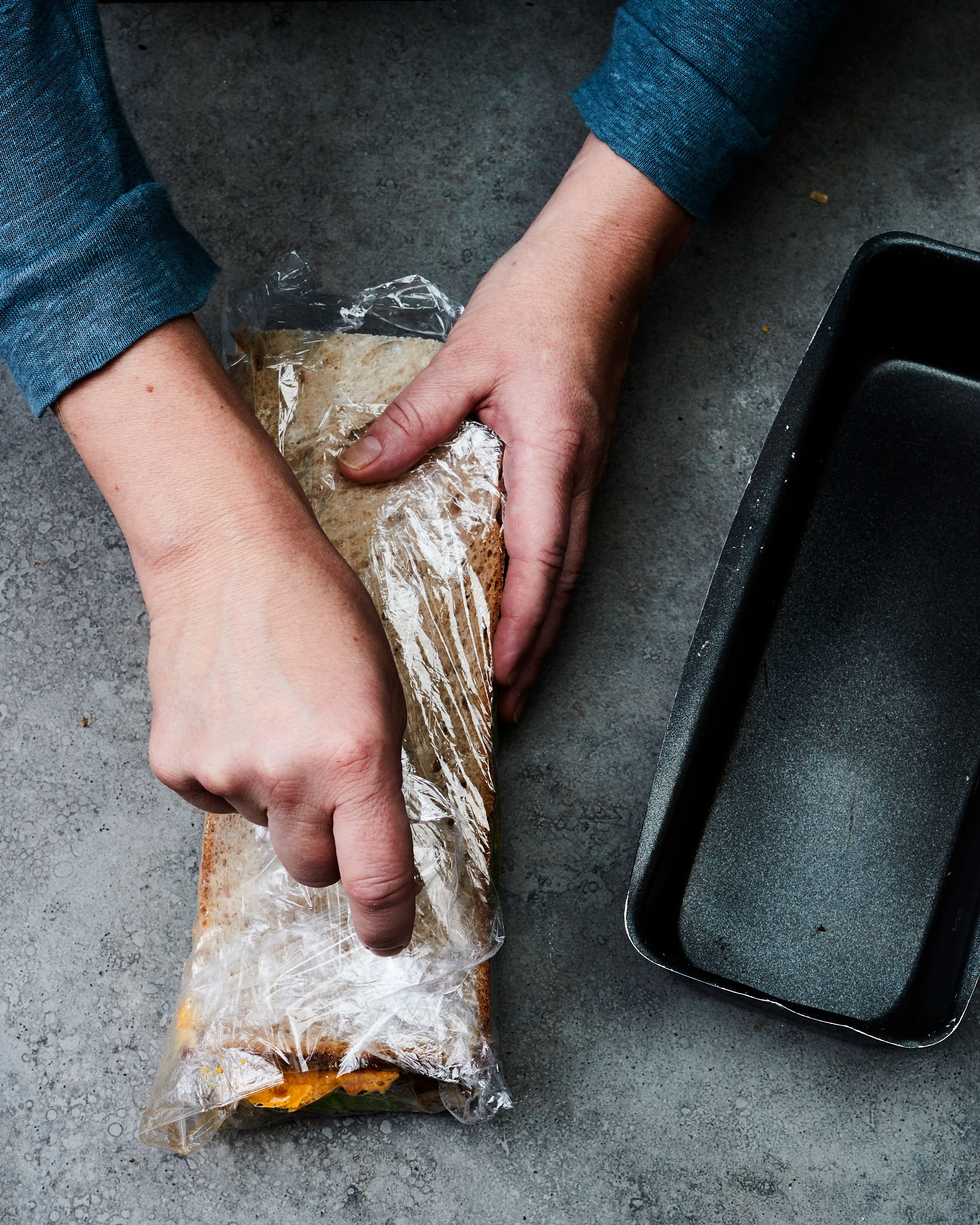 3. Kääri kakku kelmuun, laita vuokaan painon alle ja anna maustua yön yli.