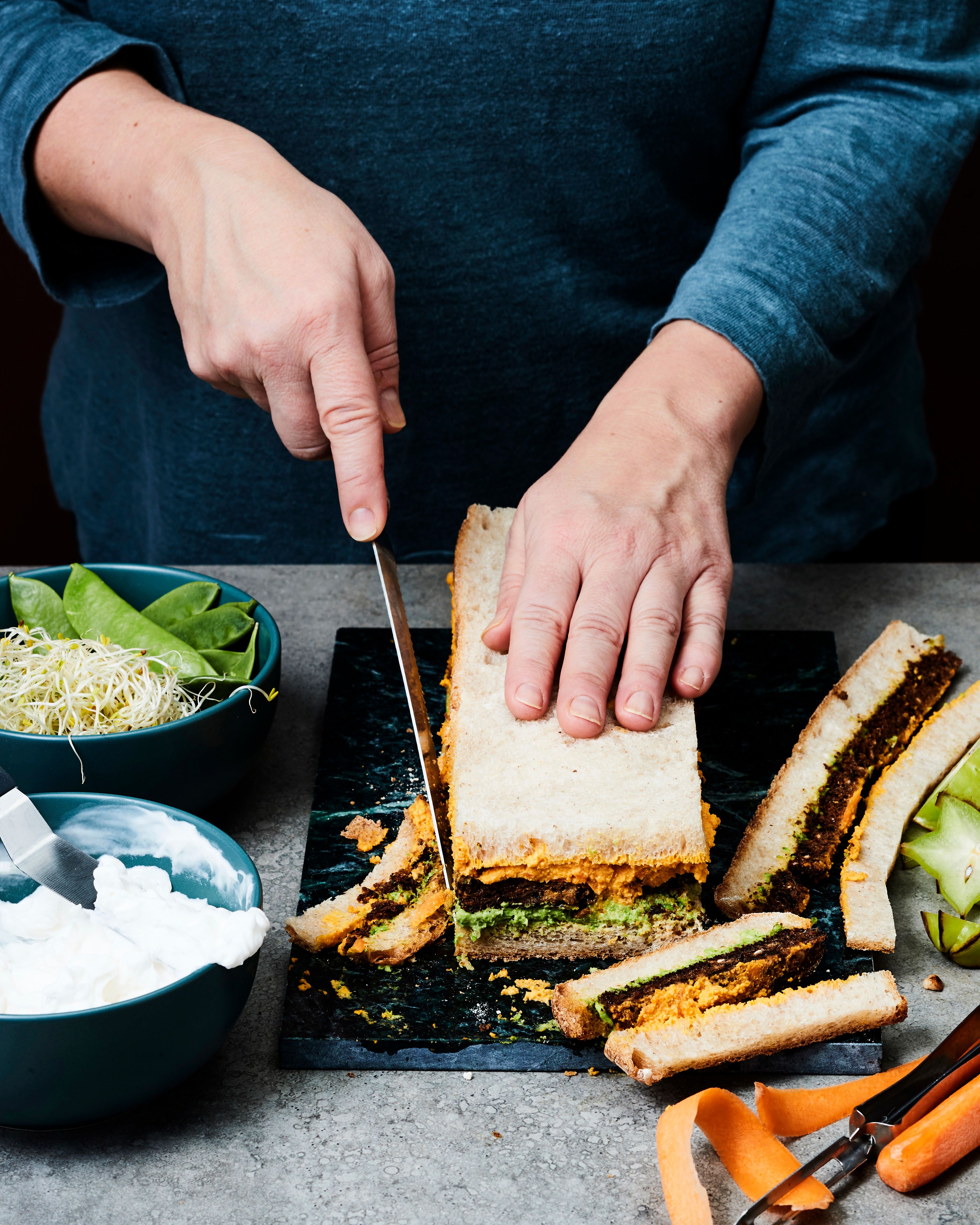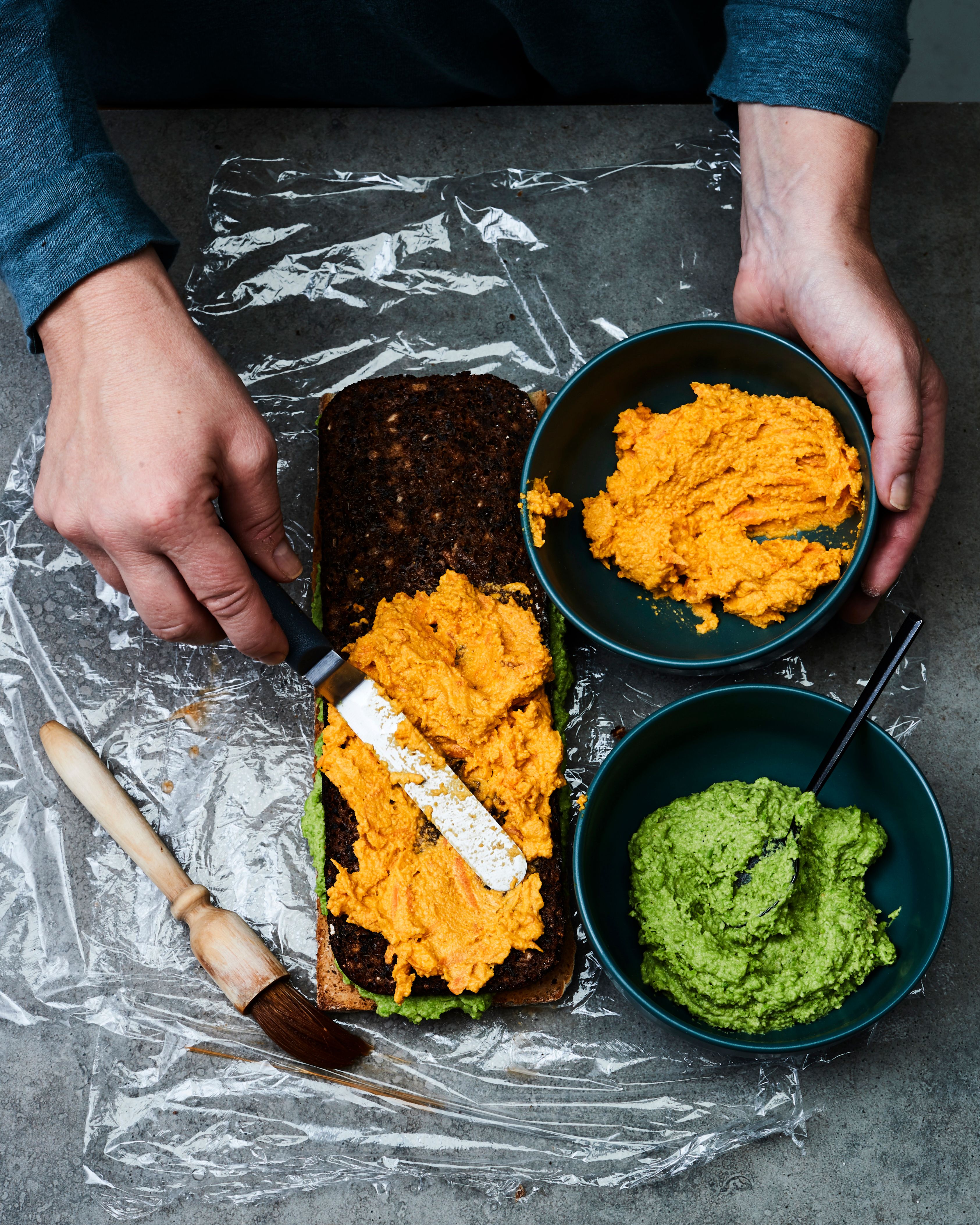 Valmista kahden kerroksen kakkuun kaksi täytettä, kolmeen kerrokseen kolme. Papu-, herne- ja kasvissoseet ovat mahtavia pohjia täytteille. Ne pehmentävät leipää, jolloin lisäkosteutta ei juurikaan tarvita.