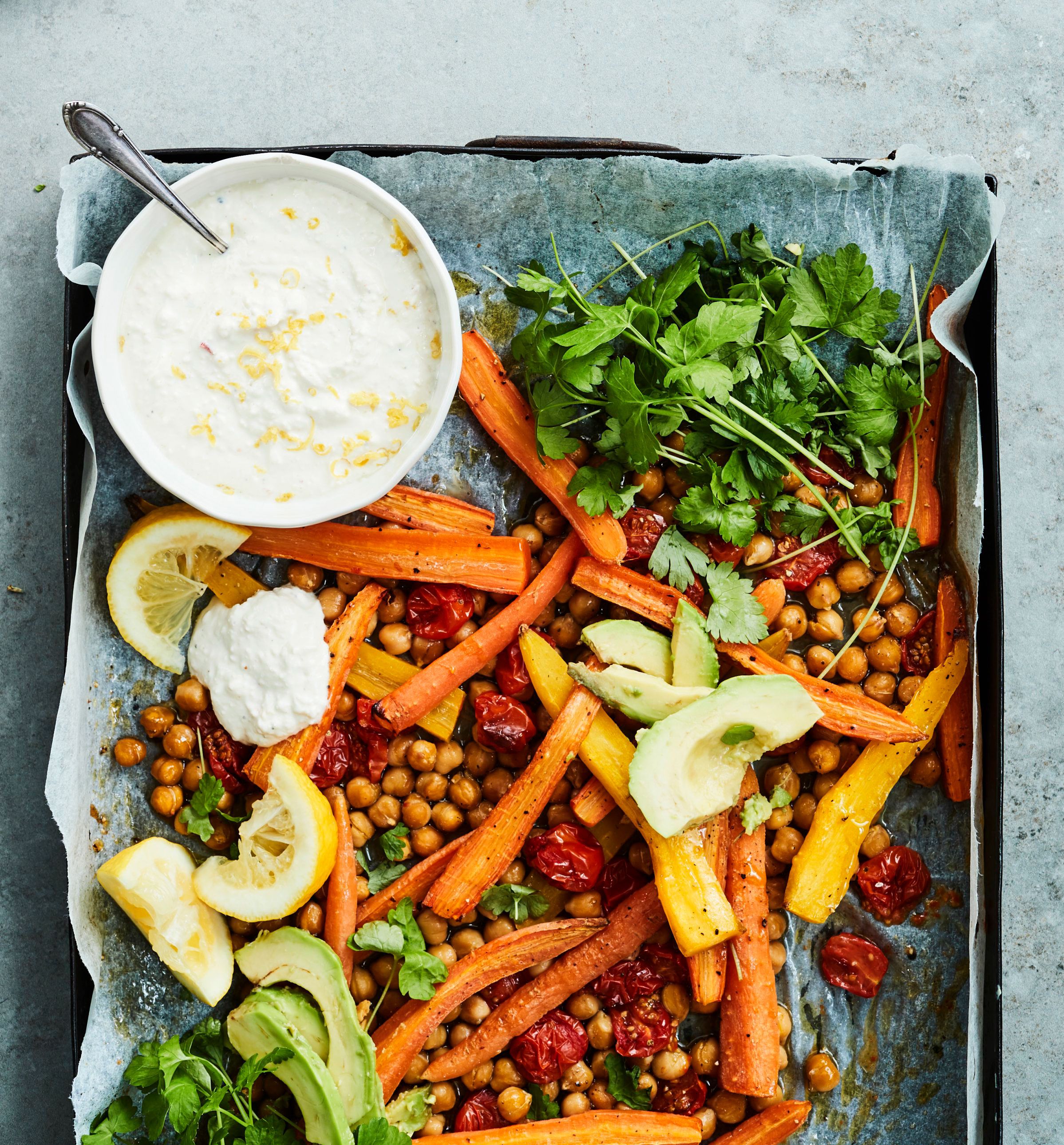 Tai sitten voit valita pellillesi vain sellaisia kasviksia, joilla on sama paahtoaika. Esimerkiksi porkkanatikut, kirsikkatomaatit ja kikherneet kypsyvät samassa ajassa. Voit tehdä niistä esimerkiksi paahdetun salaatin, joka maistuu ihanalta jogurttipohjaisen fetadipin kanssa.
