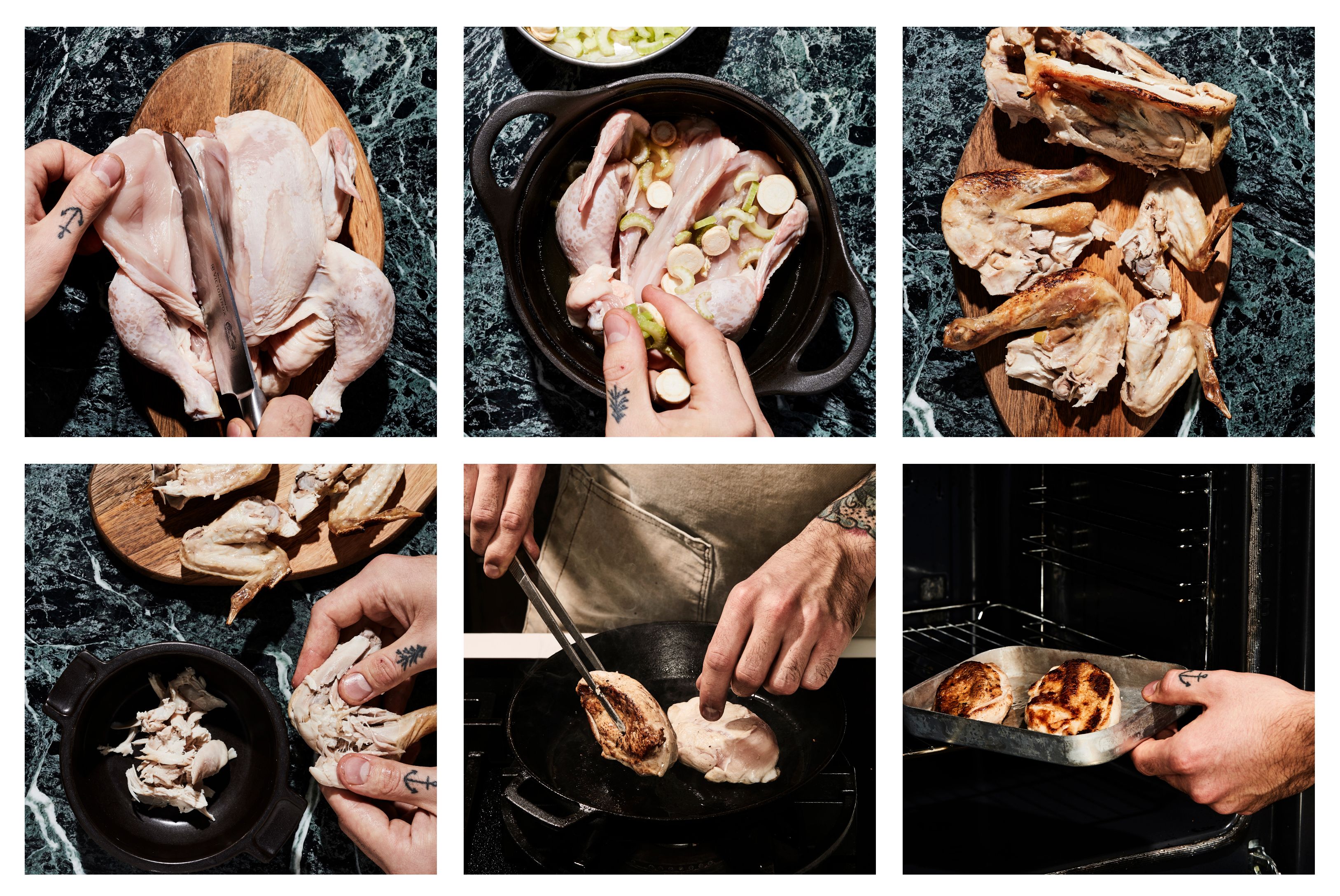 Miten saat kokonaisesta broilerista takuulla kypsää ja silti kauttaaltaan pehmeää ja mehevää? Kypsentämällä rintafileet erikseen ja hauduttamalla loput herkulliseksi padaksi.