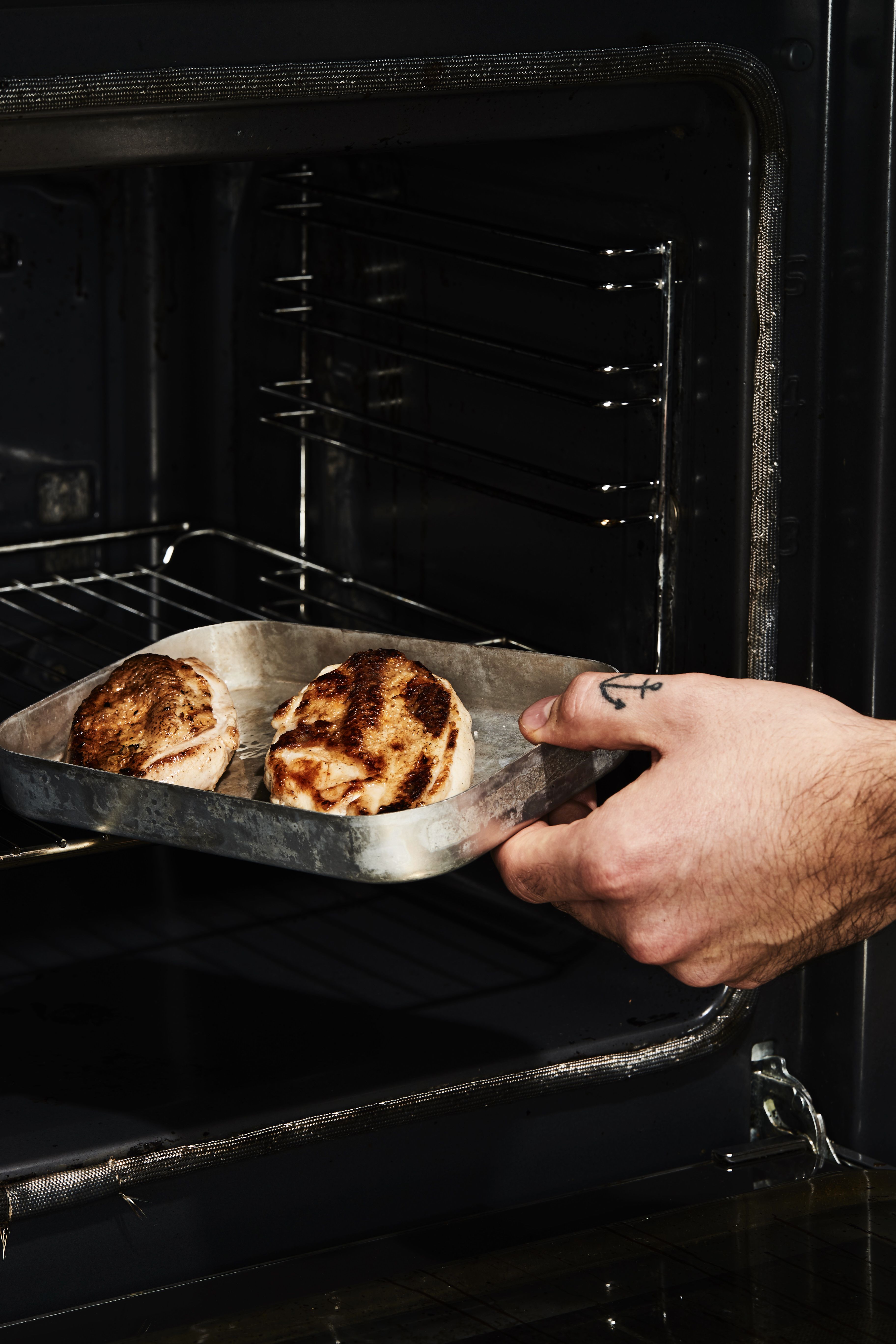 2. Kypsennä fileet loppuun 200-asteisessa uunissa helpolla intervallimenetelmällä. Eli pidä rintafileitä 3 minuuttia uunissa, jonka jälkeen anna niiden olla 3 minuuttia huoneenlämmössä. Kokeile kypsyyttä sormella, lihan pitäisi tuntua kimmoisalta. Jos liha on liian pehmeää, kypsennä vielä 3 minuuttia ja anna levätä sama aika. Kun lihat tuntuvat kypsiltä ja kimmoisilta, leikkaa rintafileet puoliksi.