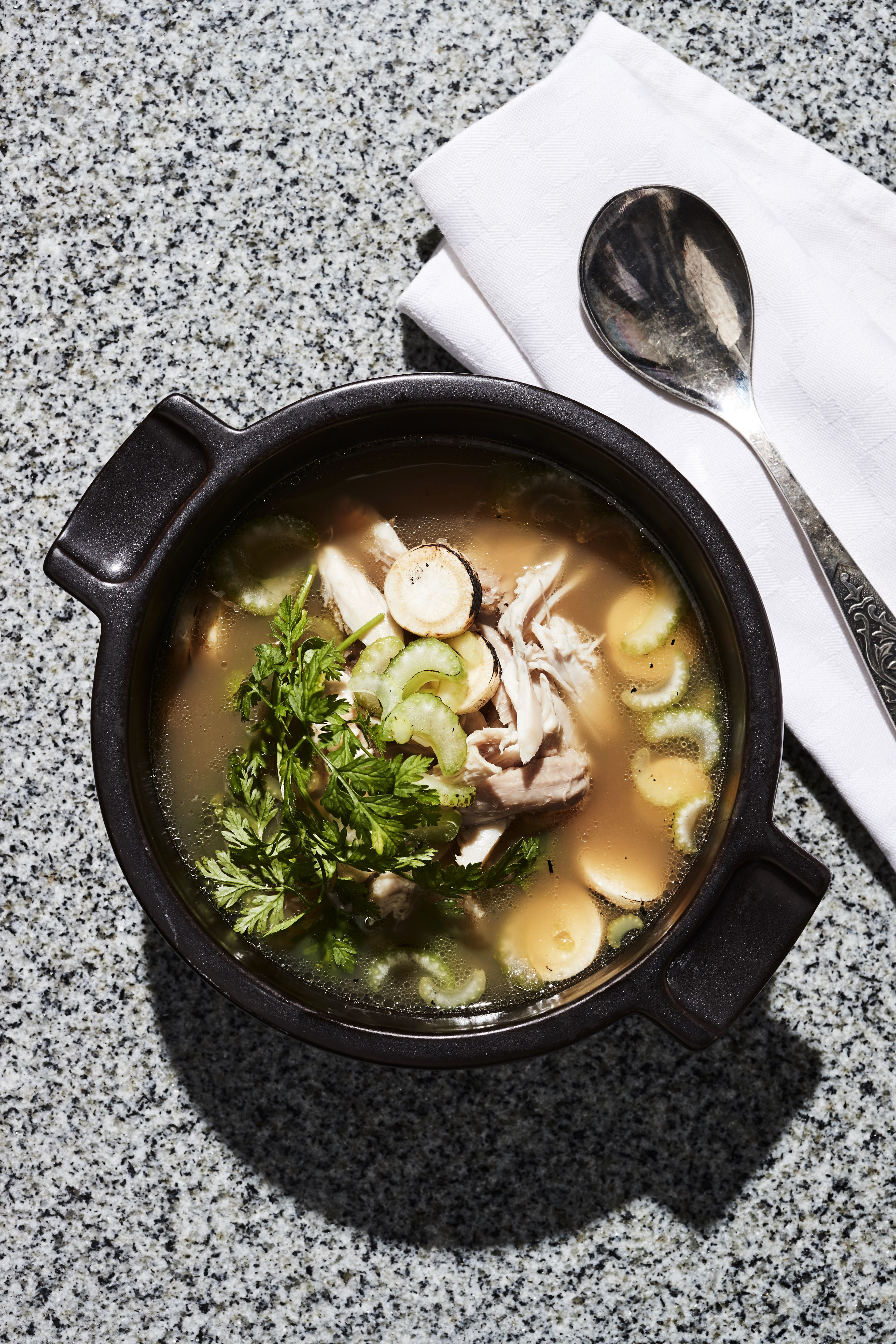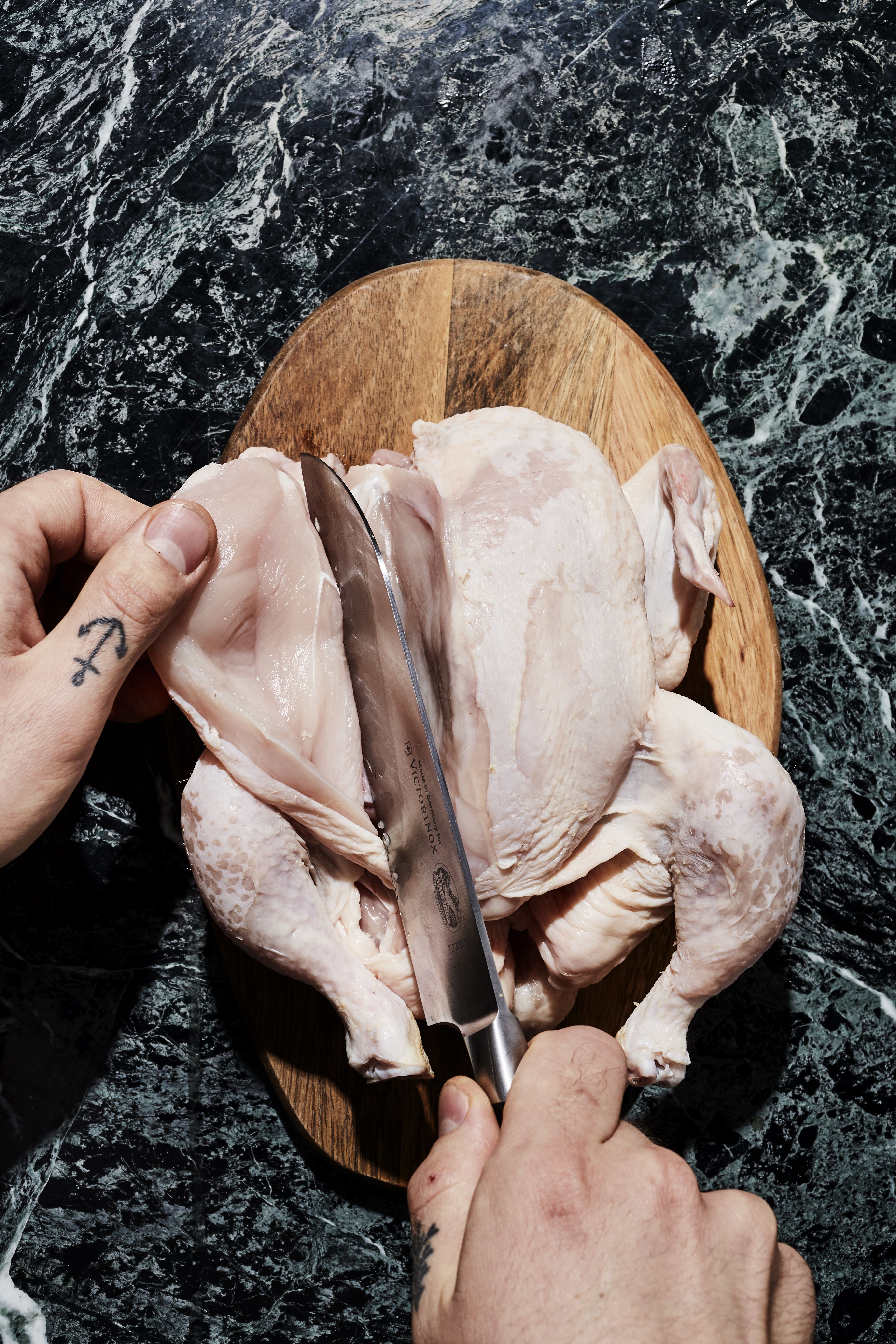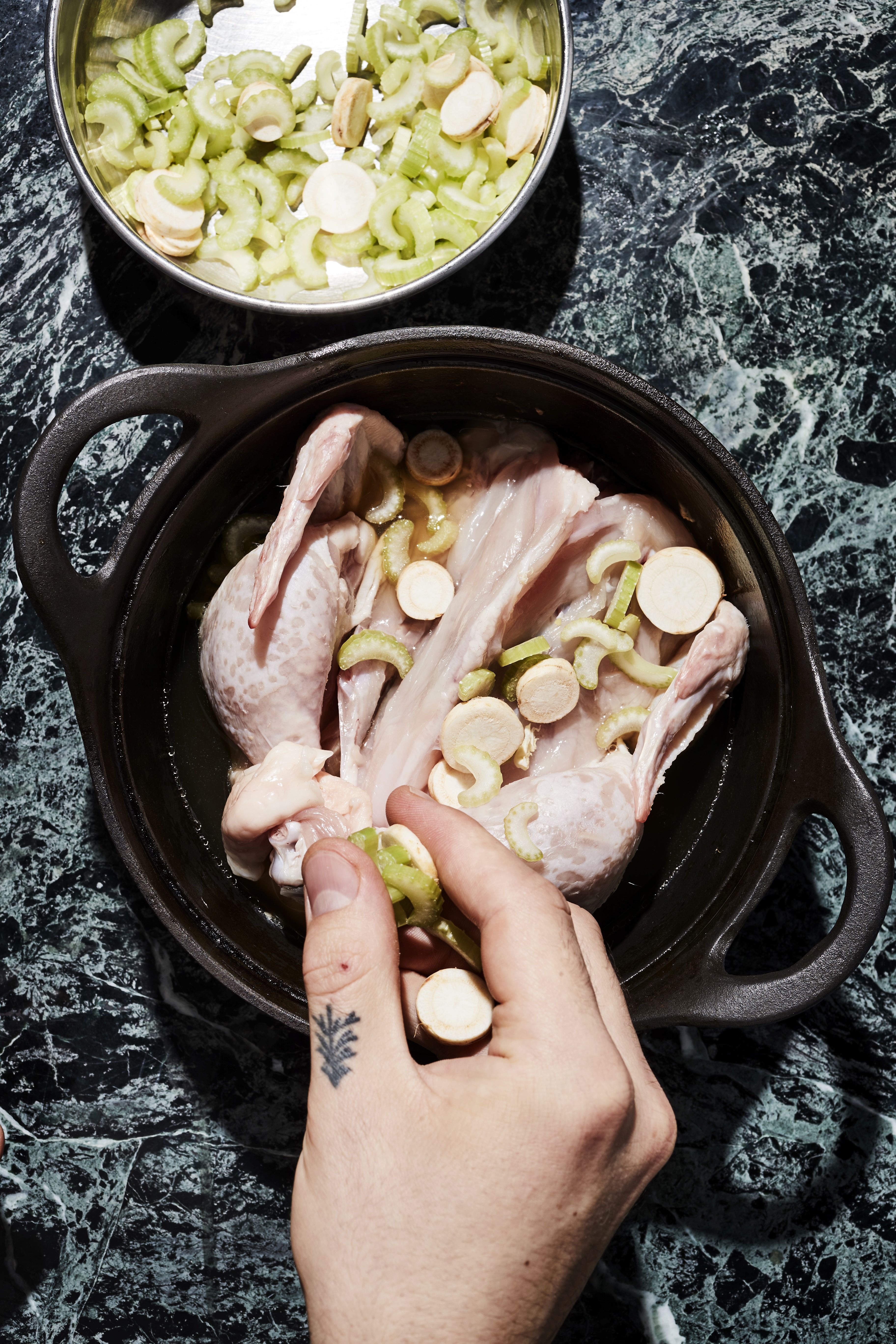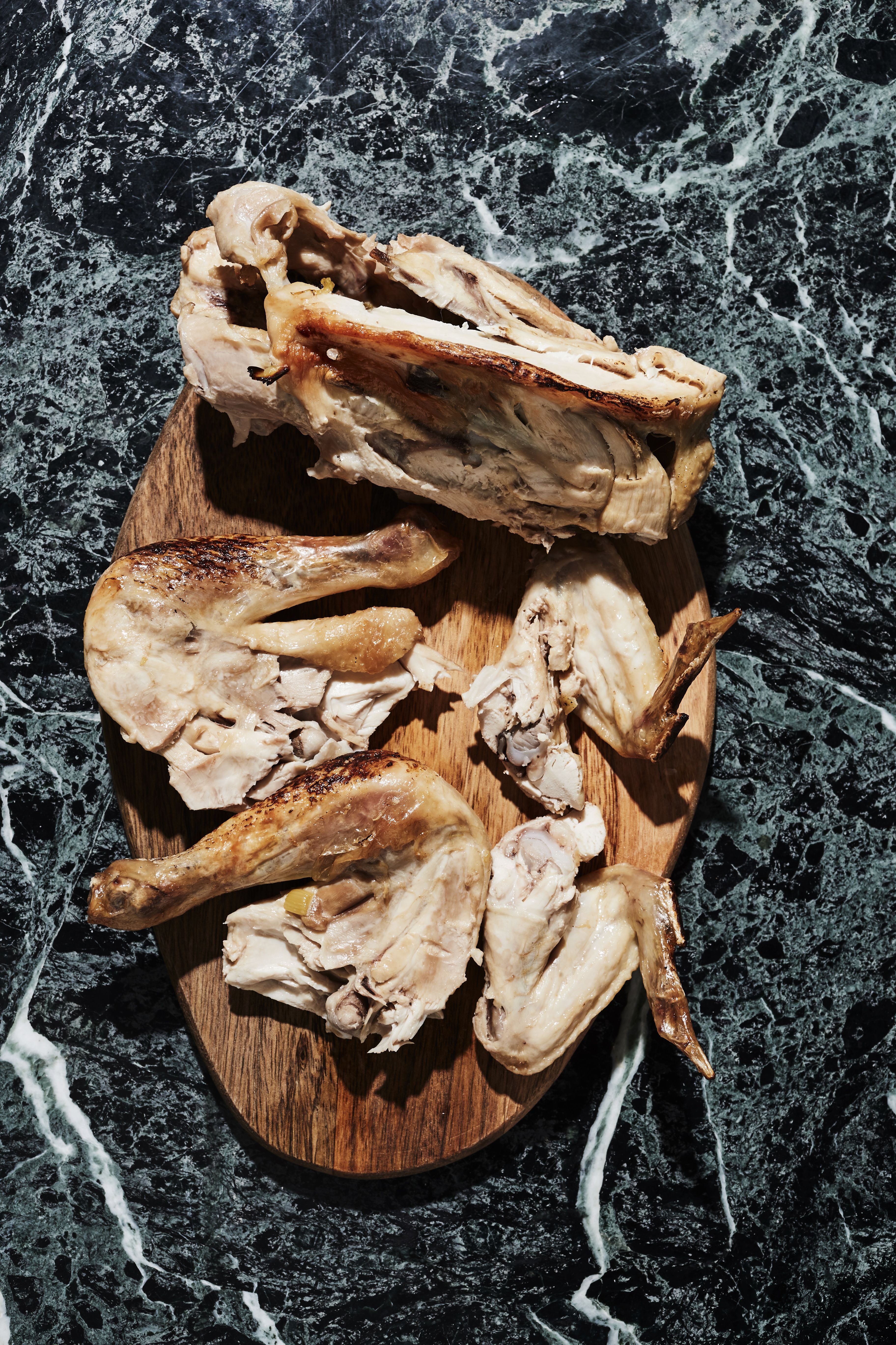 Aluksi rintafileet erotetaan rangasta. Ranka ja koivet haudutetaan kasvisten kanssa liemessä.