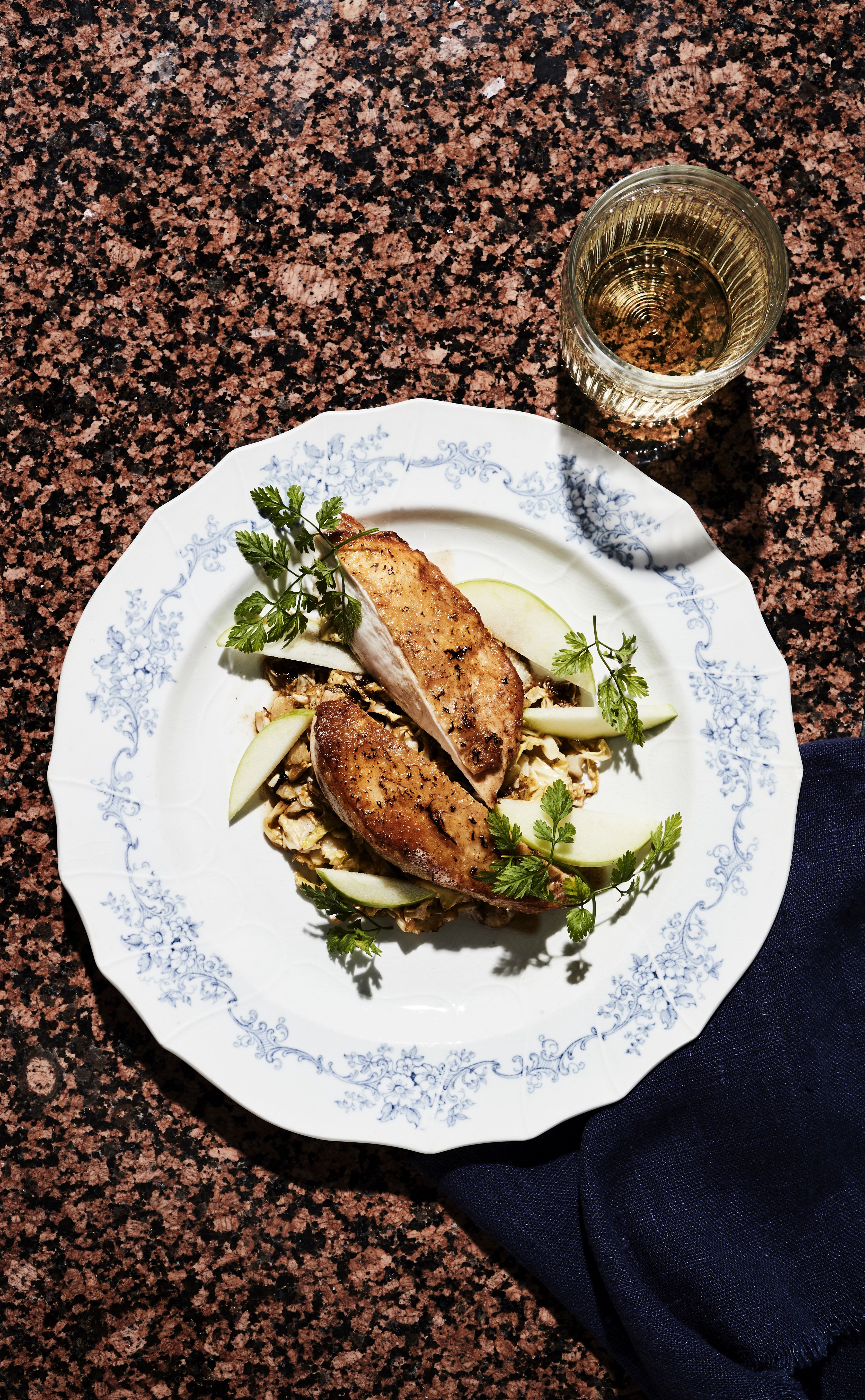 3. Hauduta broilerinfileiden kypsyessä lisukkeeksi savoijinkaalia pannulla runsaassa voissa. Mausta suolalla, hunajalla ja sinapilla. Jaa kaali lautasille ja aseta halkaistut broilerinrinnat päälle. Viimeistele annos omenaviipaleilla, kirvelillä ja pannuun jääneellä paistoliemellä.