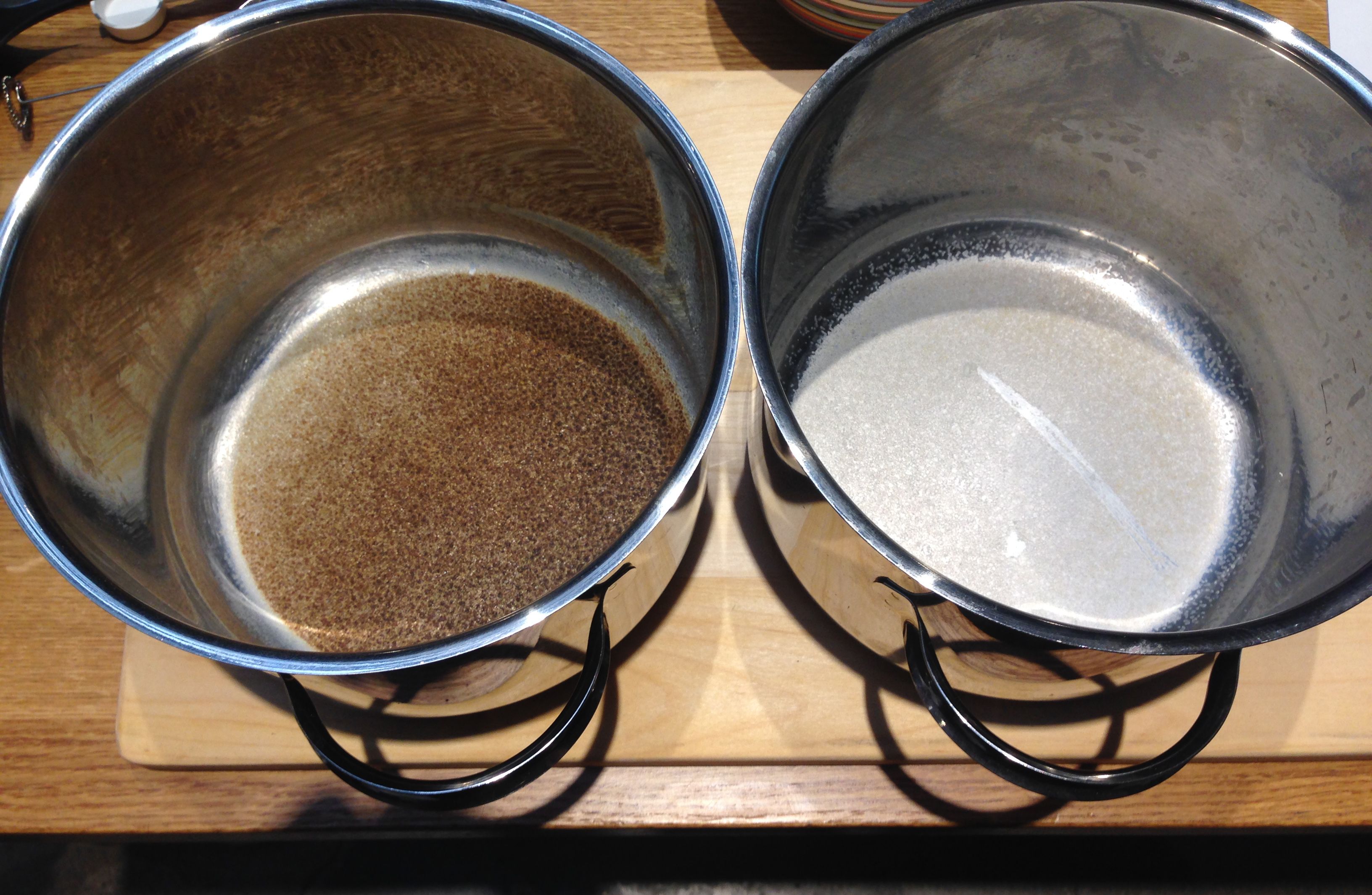 Kahdessa samanlaisessa kattilassa keitettiin yhtä pitkään tavallista maitoa (vasemmalla) ja Kiehua (oikealla).