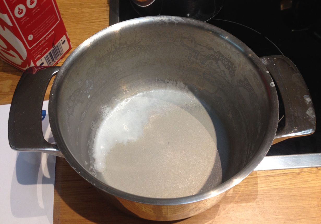 Valion koekeittiön Jani Lamminperä kehottaa keittämään maitoa maltillisella lämpötilalla. Laitamme maidon kuitenkin kunnon testiin: kattila puolilleen maitoa, levy täysille ja menoksi. Puuroa valmistaessa maitoa on hyvä sekoitella jo rakenteen vuoksi, mutta pelkän maidon annamme kiehua rauhassa. Se alkaa maidolle tyypilliseen tapaan kuohua. Kiehutamme varmuuden vuoksi vielä vähän nähdäksemme kunnollisen tuloksen. Maito ei tosiaan pala pohjaan, mutta pohjalle jää pieni valkoinen kalvomainen peite. Tiskatessa se lähtee helposti tiskiharjan ja tiskiaineen avulla.
