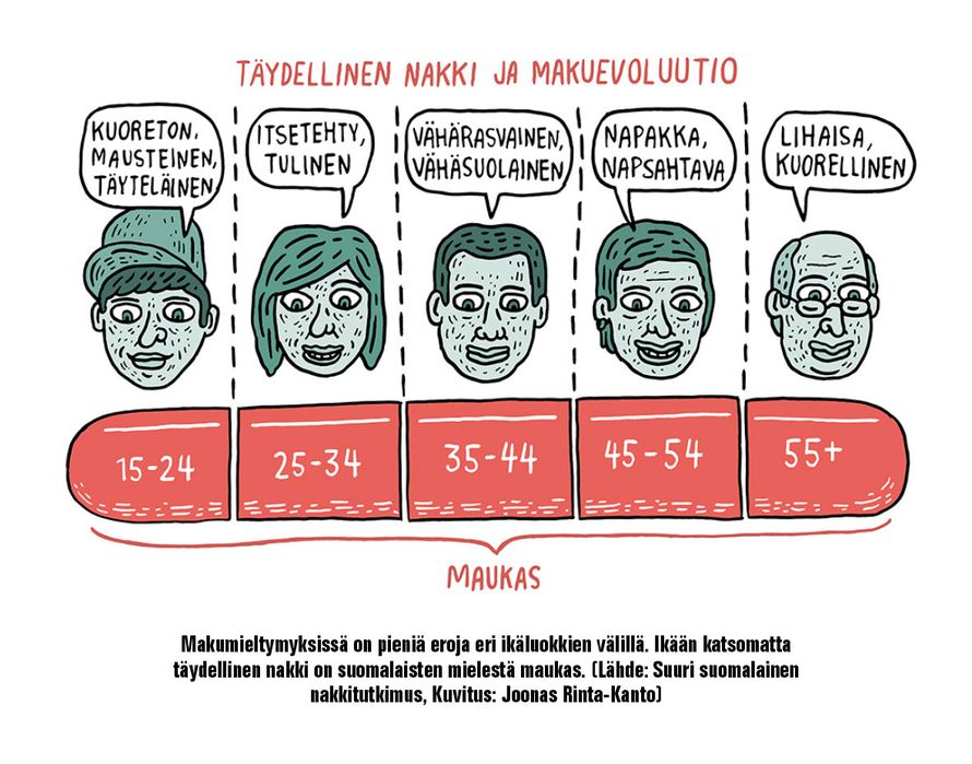 Kaikkien tutkimukseen vastanneiden ikäryhmien mielestä nakin pitää olla maukas. Ikäryhmien väliset mielipide-erot koskevat lähinnä nakkien rakennetta, sillä siinä missä nuoret 15–24-vuotiaat suosivat kuorettomia nakkeja, hieman varttuneemmat, 45–54-vuotiaat, haluavat nakin olevan napakka ja napsahtava. Lihaisa ja kuorellinen nakki puolestaan on yli 55-vuotiaiden suosikki.