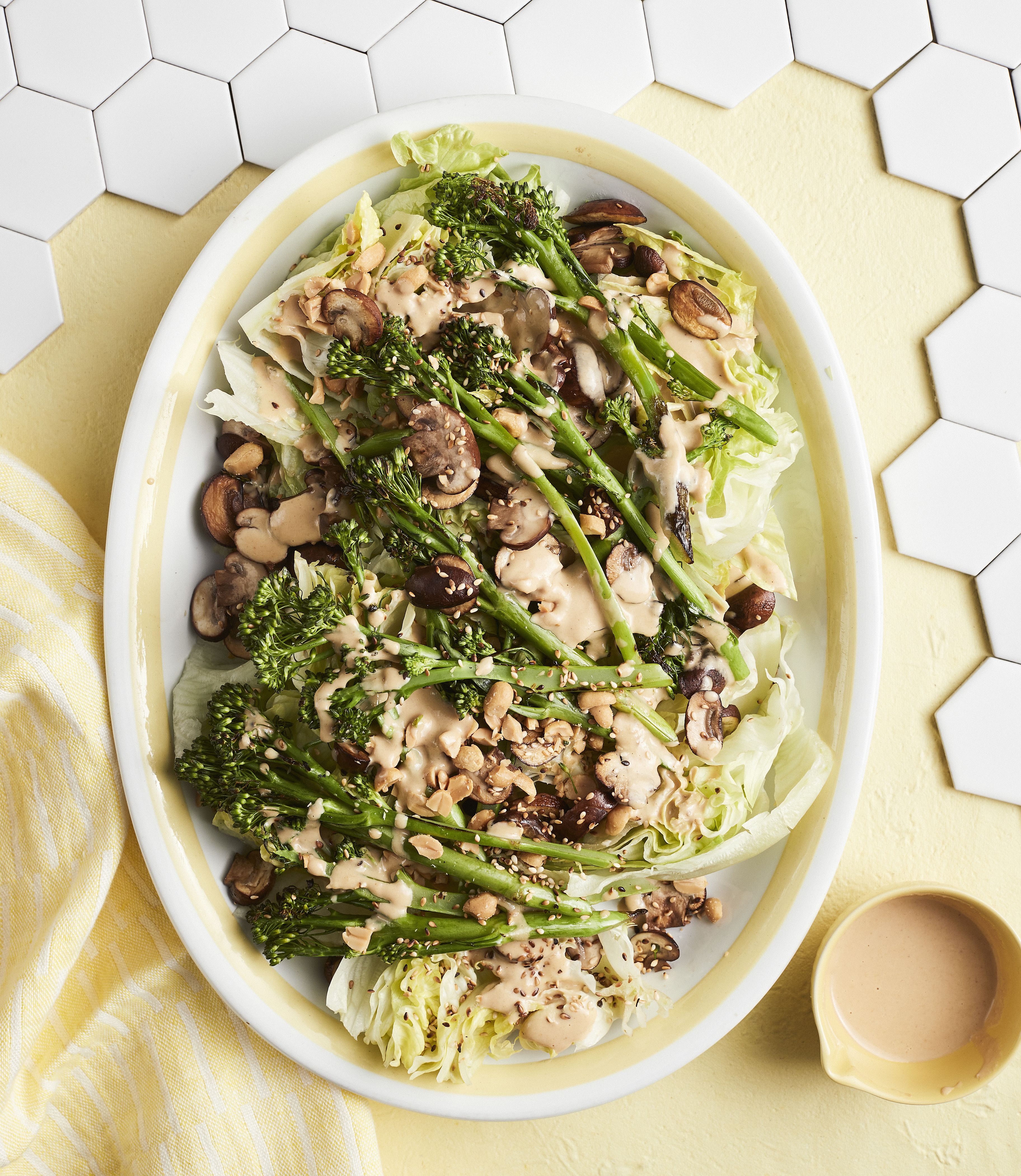 Tässä salaatissa riittää kontrasteja. Kylmä ja rapea jäävuorisalaatti yhdistyy lämpimiin kypsennettyihin mutta napakoihin broccoliineihin. Paistetut sienet tuovat reilusti makua, ja salaatin päälle ripoteltavat suolapähkinät lisärapeutta. Kermaisen täyteläinen miso-tahinikastike viimeistelee makuelämyksen.
