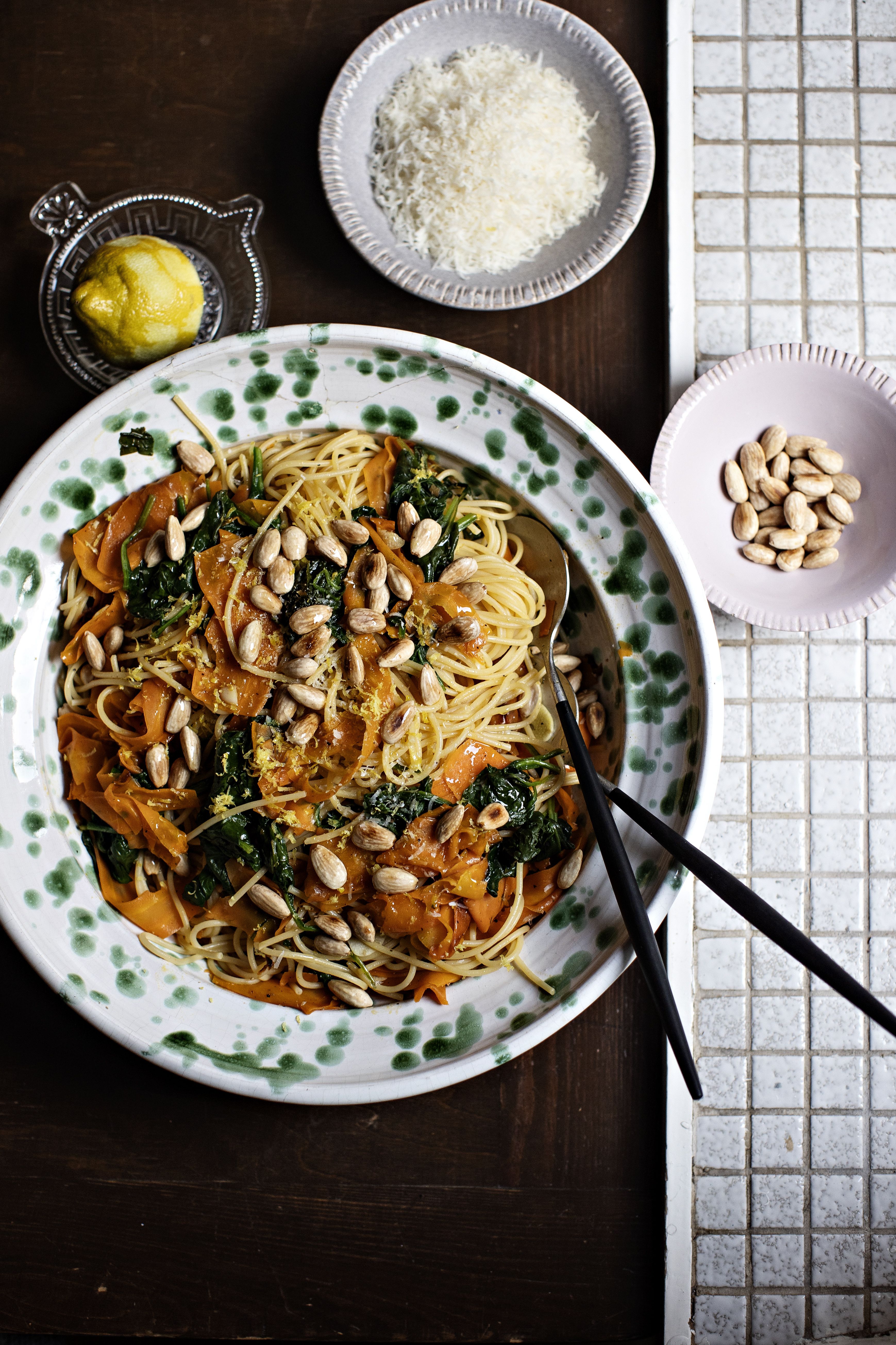 Pasta on vastaus silloin, kun tarvitaan jotain täyttävää ruokaa äkkiä pöytään. Tässä kolmen värin pastassa ei aineksilla hienostella, keitetyn spagetin joukkoon paistetaan porkkanaa ja pinaattia sekä paahdetaan manteleita. Makua ruokaan antaa sitruuna, josta käytetään mehu sekä kuoriraaste.