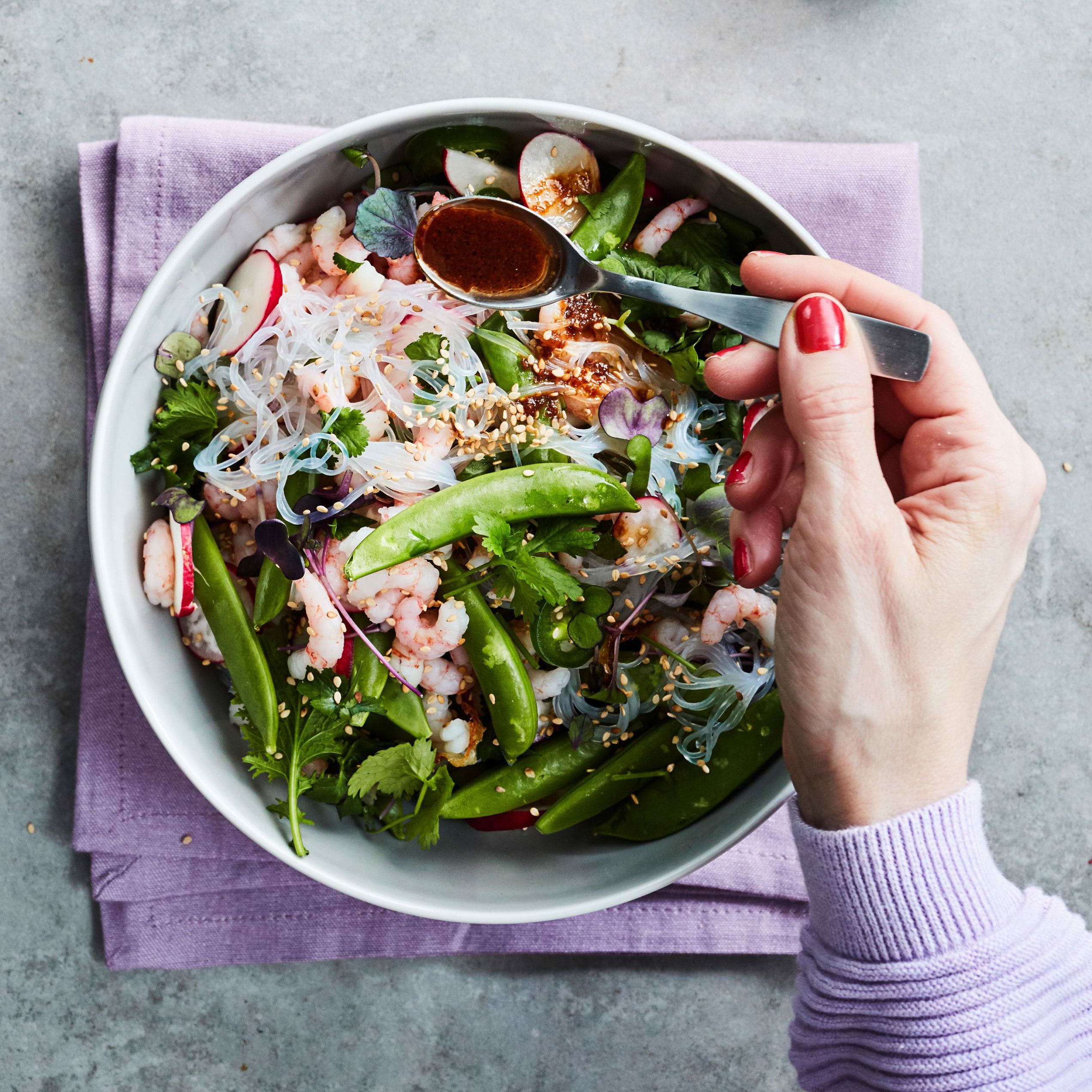 Nuudelisalaatit ovat nopeita ja loputtomasti muunneltavissa. Ne ovat kevyitä ja raikkaita, ainakin jos käyttää paljon tuoreita yrttejä sekä vihreitä kasviksia. Katkaravut ovat hyvä proteiininlähde salaattiin, sillä niiden ei tarvitse kuin ehtiä sulaa. Hyvä ja maukas kastike kruunaa tietysti salaatin kuin salaatin, tällä kertaa siihen käytetään muun muassa misoa.