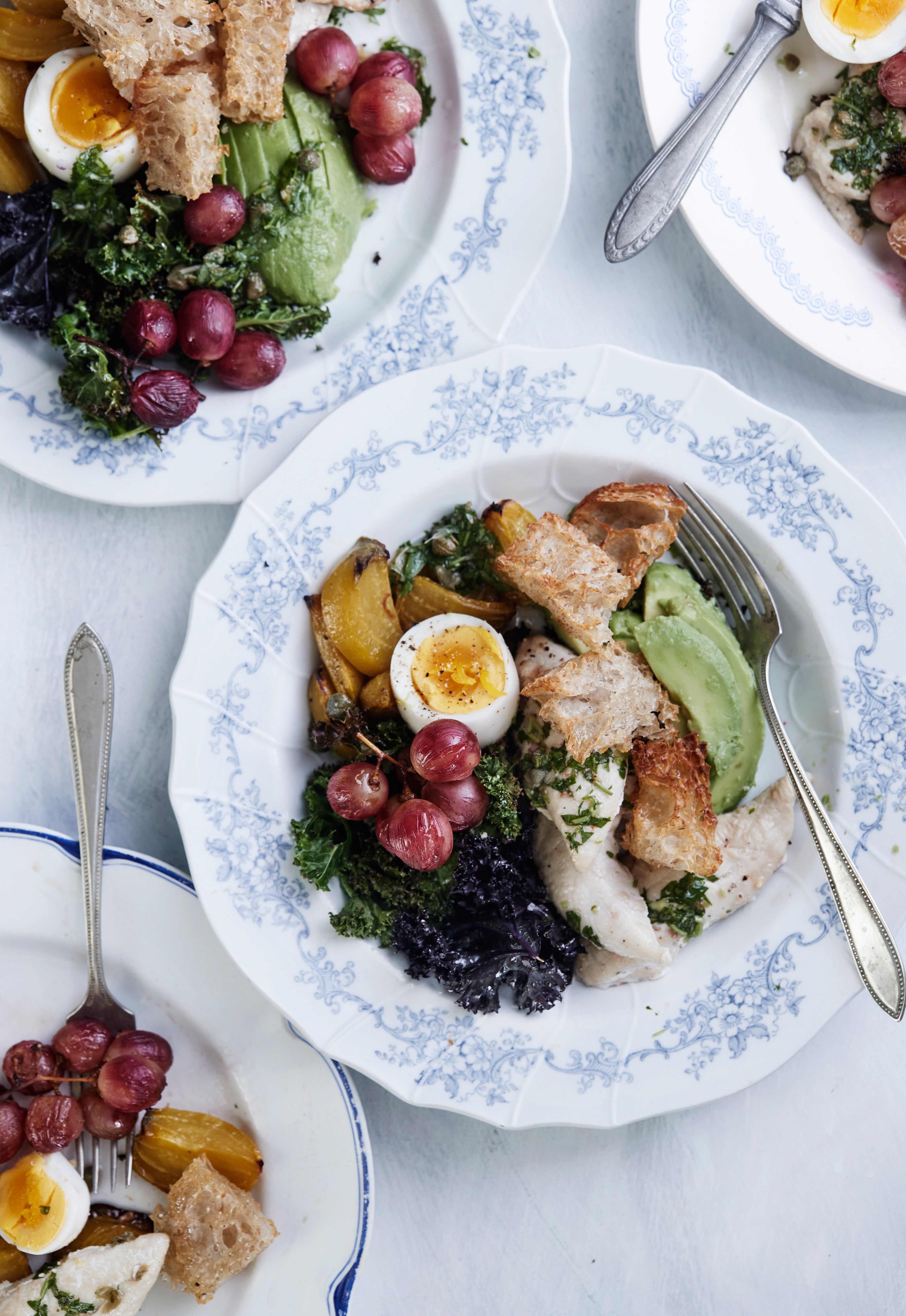 Kylmän ajan salaatit vaativat välillä hieman tuhdimpaa rakennetta. Uunissa paahdetut kasvikset ja broileri tekevät salaatista ruokaisan. Lisäksi keitetty kananmuna ja avokado tuovat täytettä vatsaan, ja leivästä saa kuituja.