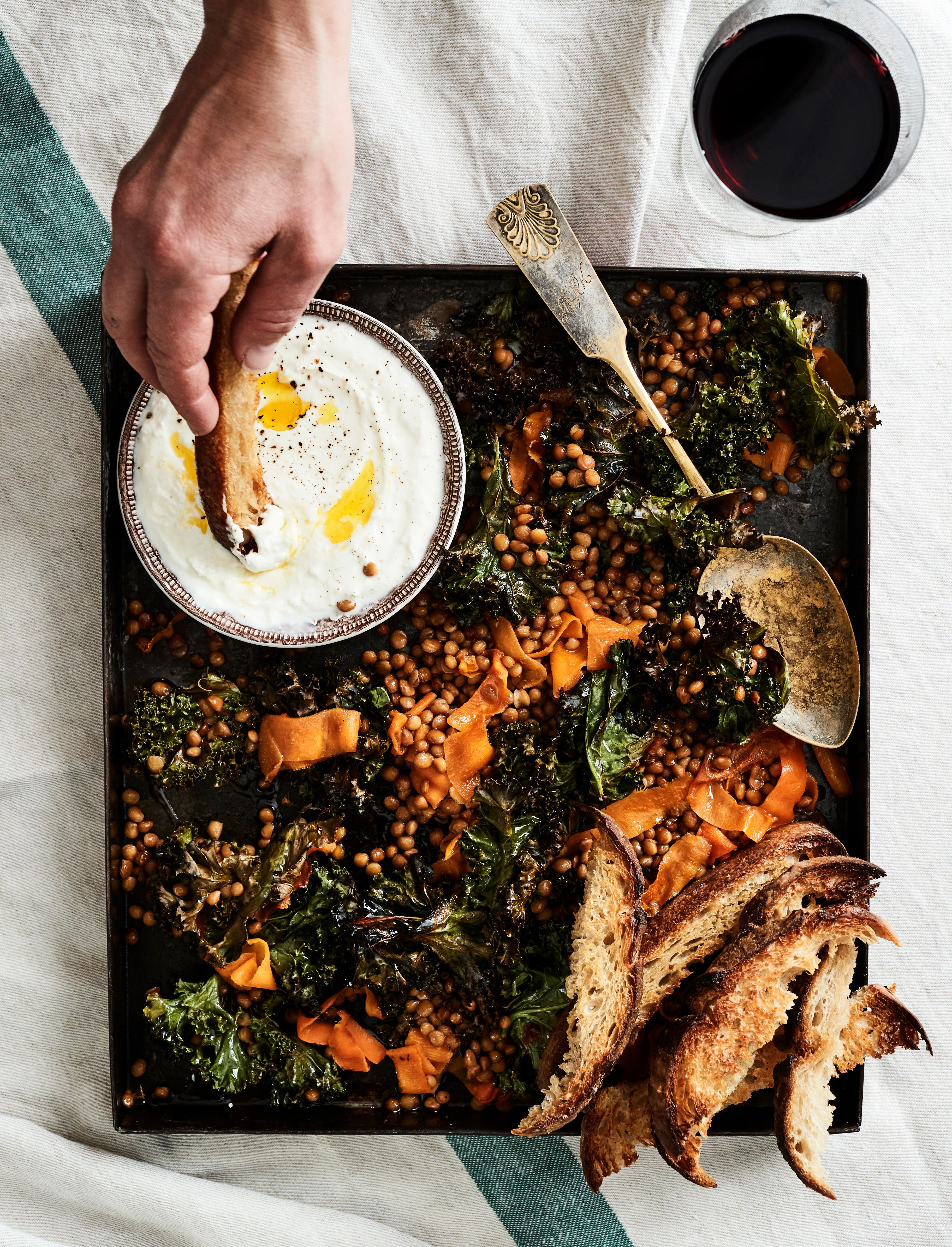 Linsseistä ruokaisuutta saava lämmin peltisalaatti syntyy vaikka uunin jälkilämmöillä. Erilaisia tekstuureja sekä värejä sisältävä salaatti sopii hyvin talveen, ja juureksia voi vaidella mielensä mukaan. Jogurttinen fetadippi ja rapeat leipäpalat viimeistelevät aterian.